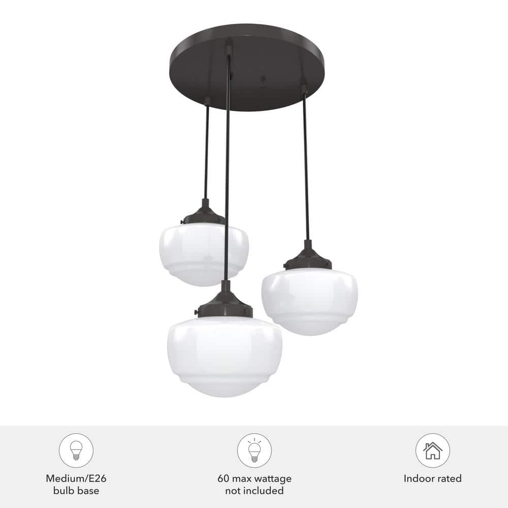 The Hunter Saddle Creek 3-Light Chandelier in noble bronze combines vintage schoolhouse charm with modern elegance. Featuring cased white glass shades and a durable metal finish, this chandelier is ideal for adding a sophisticated touch to any living or dining space. With a flexible hanging length and easy installation, it is perfect for both DIY enthusiasts and pros.