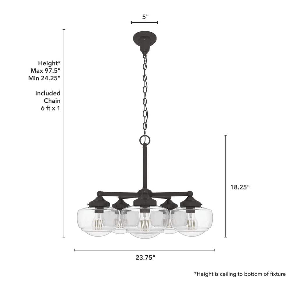 Elevate your space with the Hunter Saddle Creek 5-Light Chandelier, a sophisticated fusion of modern design with traditional schoolhouse charm. Its noble bronze finish accentuates the clear seeded glass shades, creating a brilliant illumination perfect for any room. Designed for durability, it adds a touch of elegance to kitchens and foyers with minimal assembly required.