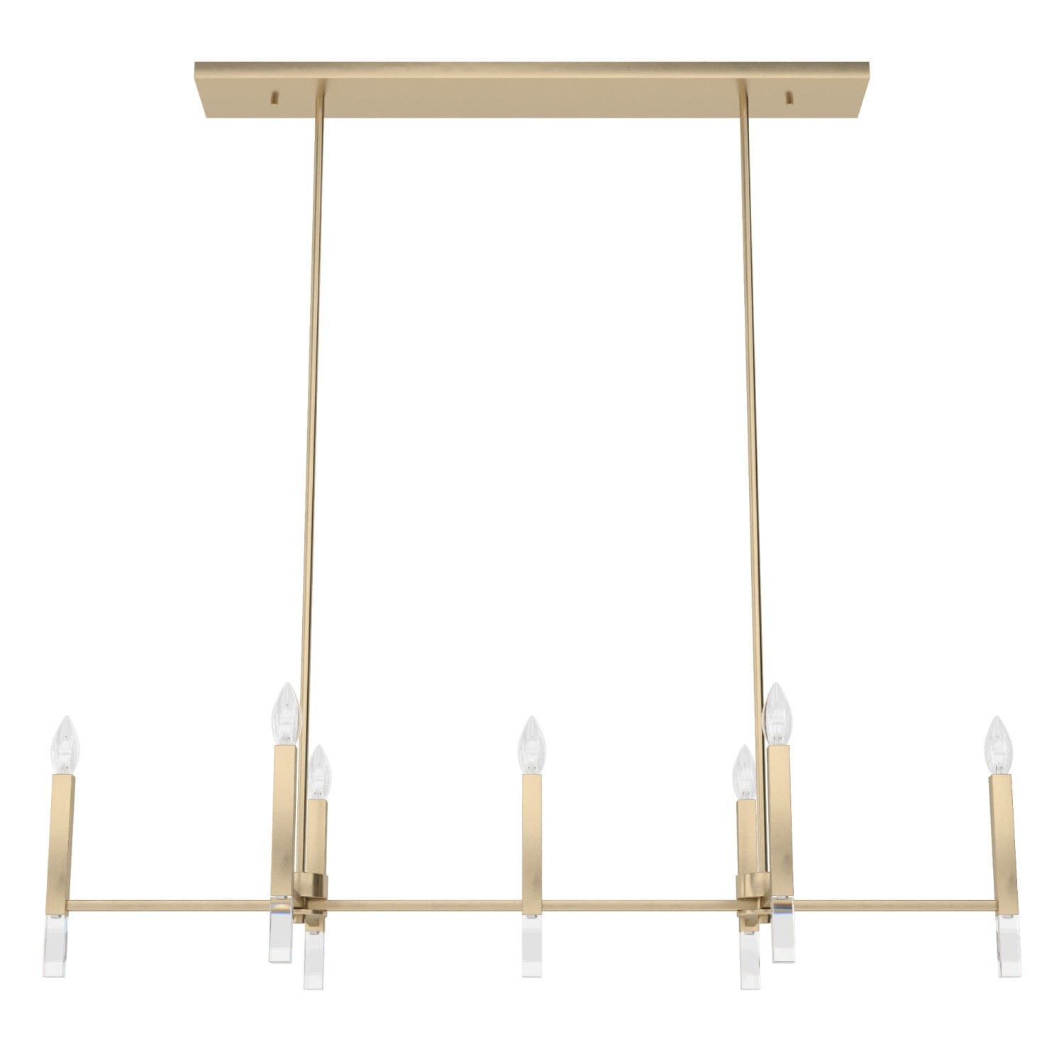 The Hunter Sunjai linear chandelier pairs modern minimalism with glamorous candlestick styling for dining rooms and kitchens. Seven metal candles with geometric accents deliver bright, even illumination and a sleek Alturas Gold finish that elevates contemporary spaces.