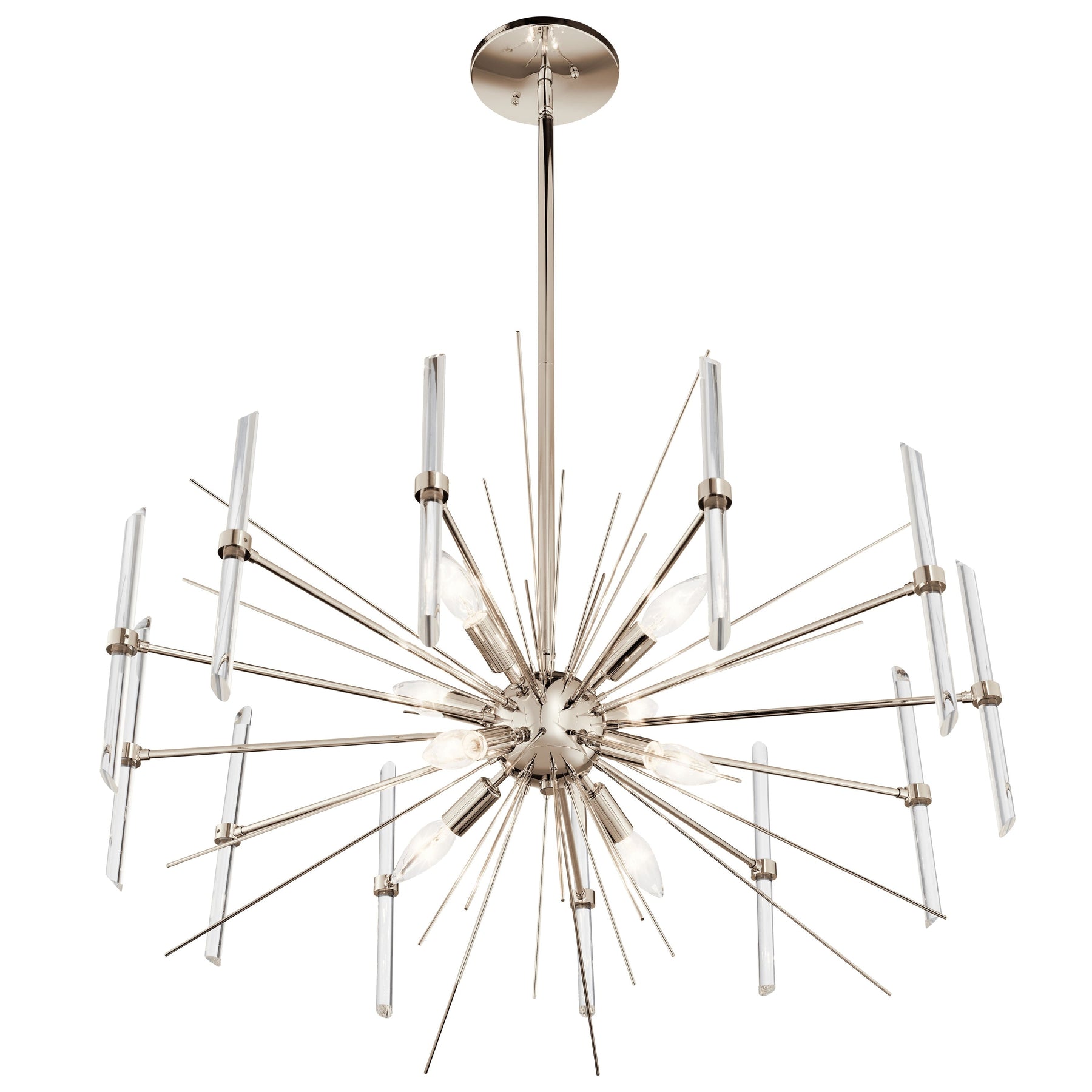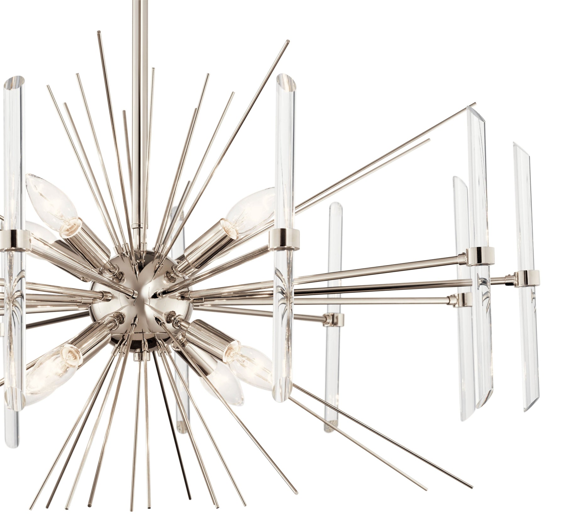 Elevate your space with the Kichler Eris 8-Light Chandelier, where mid-century modern charm meets contemporary elegance. Crafted in polished nickel with striking crystal accents, it's a statement piece ideal for dining rooms, foyers, or living spaces.