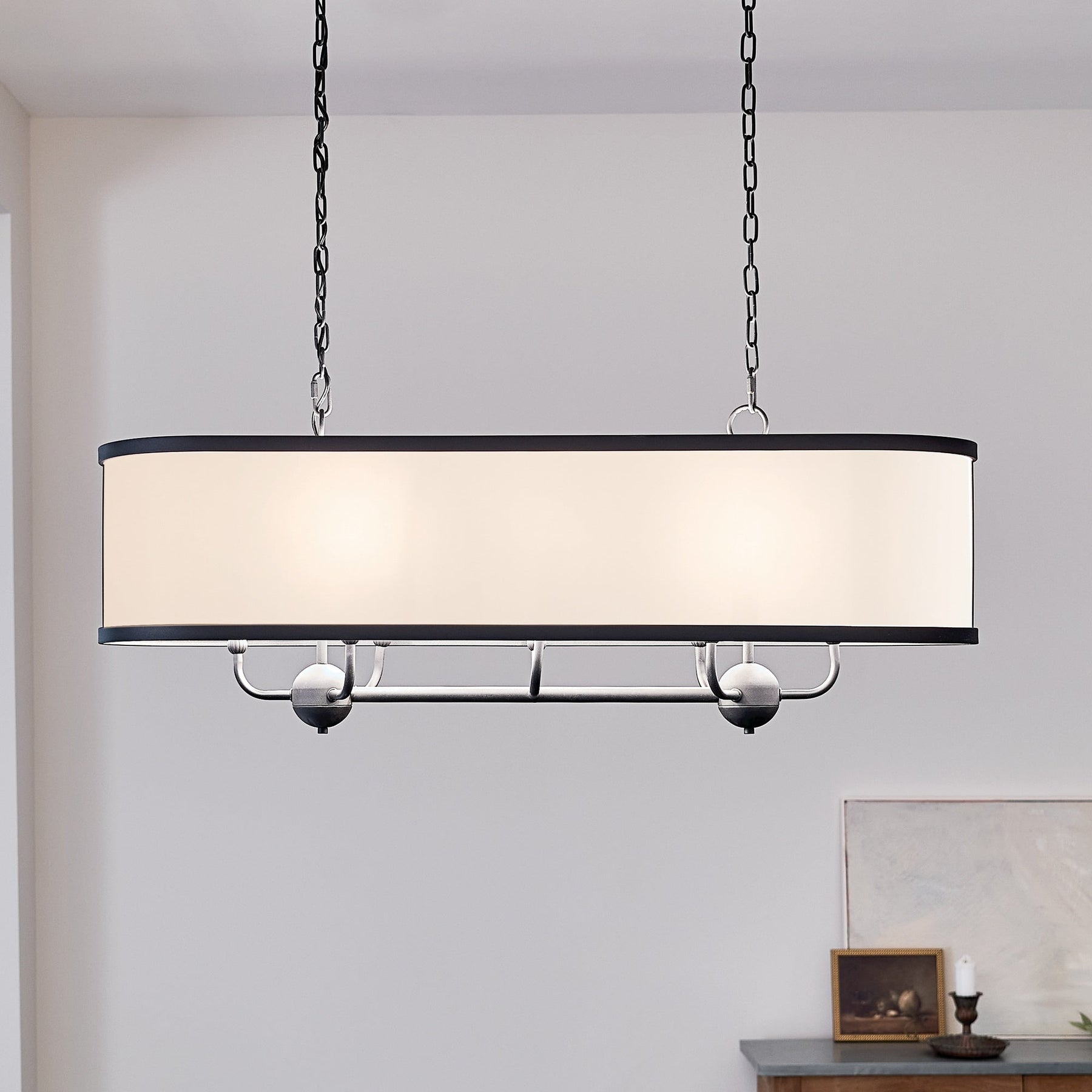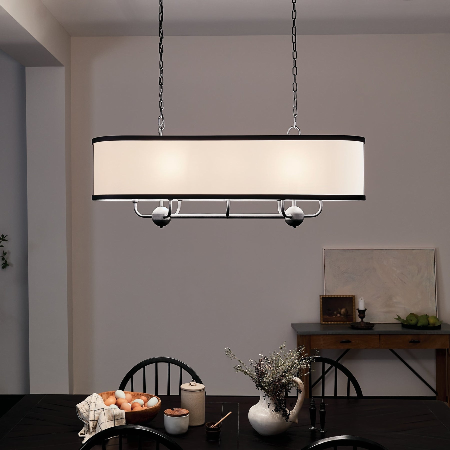 Infuse your home with the Kichler Heddle Chandelier's elegant charm—a visual ode to rustic sophistication. Its textured black finish offers a sophisticated silhouette, while the white fabric shade diffuses light with a poetic softness. Hang this masterpiece above a reclaimed wood dining table or in an inviting foyer to create a striking focal point. Embrace this chandelier as a cornerstone of intimate gatherings and luxurious daily living, where vintage appeal meets modern grace.