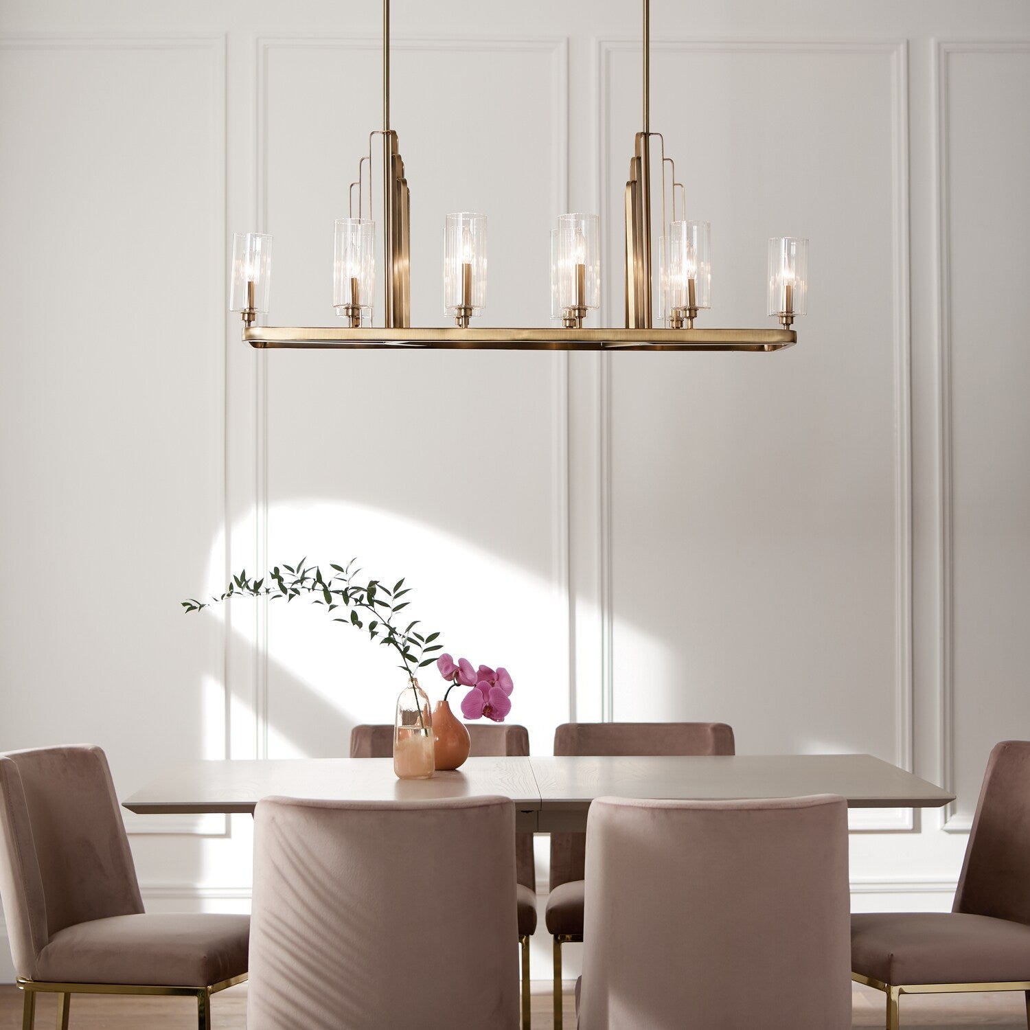 Illuminate your space with the striking Kichler Kimrose 10-Light Chandelier. With its Art Deco-inspired design and elegant Brushed Natural Brass finish, this chandelier makes a sophisticated statement. The ribbed glass shades offer a subtle lighting effect that's perfect for dining rooms, kitchens, or foyers.