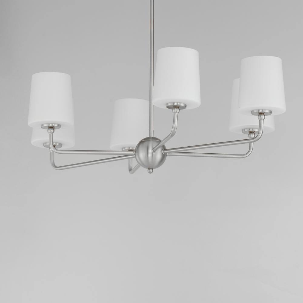 The Maxim Lighting Bristol 6-Light Silver Chandelier transforms any room with its elegant design and practical functionality. Featuring elongated curved arms with Satin White glass shades, this chandelier delivers both upward and downward lighting for versatile ambiance. Made from high-quality steel and glass, it offers easy maintenance and stylishly complements both modern and traditional spaces.