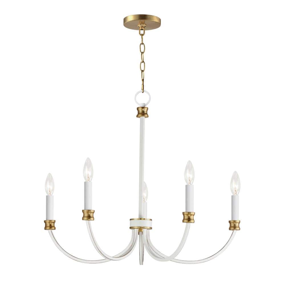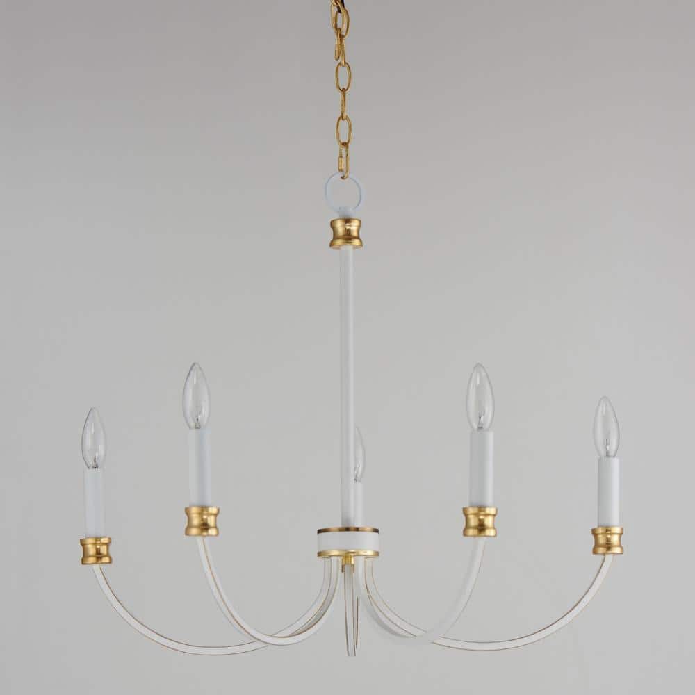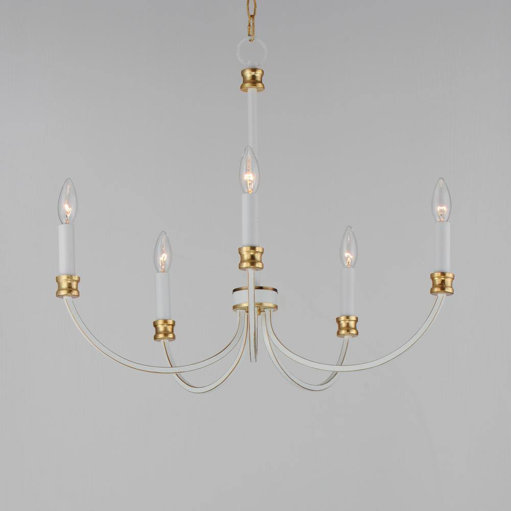 Elevate any space with the Charlton 5-Light Candelabra Chandelier from Maxim Lighting. This elegant fixture features a refined weathered white and gold leaf finish that adds a touch of sophistication to its classic design. Perfect for dining rooms and foyers, it provides both style and ample illumination.