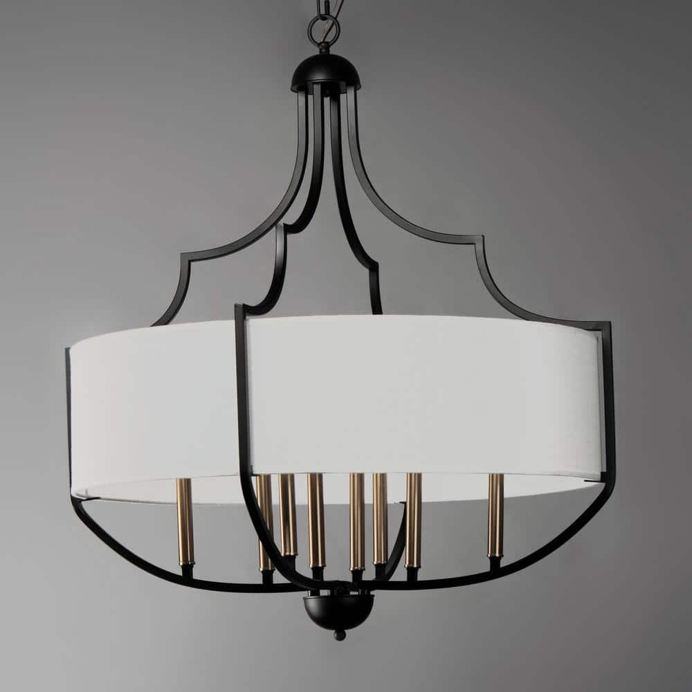 The Savant 8-Light Black Chandelier from Maxim Lighting transforms any room into a masterpiece of elegance, with its artful blend of bronze and antique brass finishes. Its sculptural frame and delicate white linen shades harmonize beautifully, casting a soft, ambient glow that enriches your living space. Hang this stunning piece over a grand dining table or central living area to serve as both a visual focal point and a conversation starter. Truly, this chandelier is an essential element for those seeking to cultivate a refined, luxurious home ambiance.