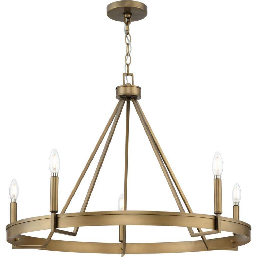 Elevate your dining or living space with the Aleswith 5-Light Farmhouse Chandelier by Progress Lighting. Its distinctive aged bronze finish complements its geometric yet simple frame, providing a perfect blend of modern and rustic aesthetics. Ideal for ambient lighting, this chandelier effortlessly enhances the atmosphere of any room.