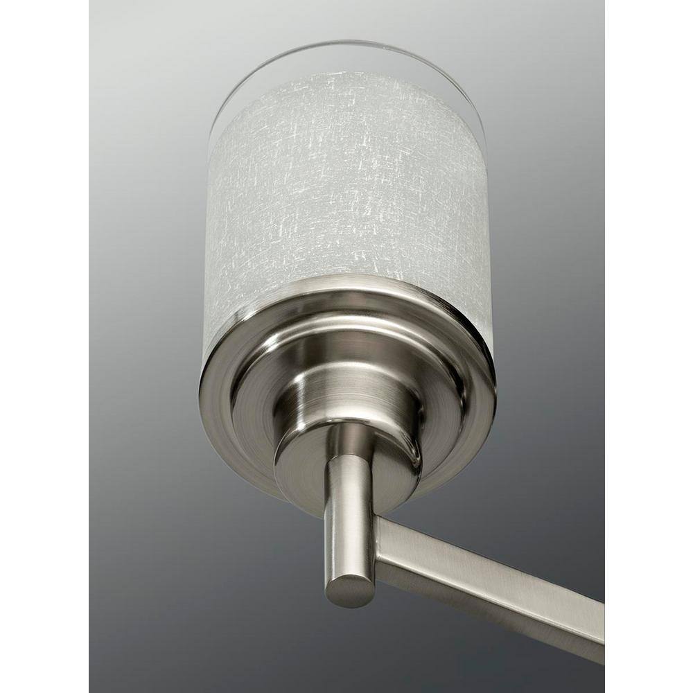 The Alexa Collection 3-Light Modern Chandelier by Progress Lighting epitomizes vintage mid-century style with its sleek brushed nickel finish and luxurious linen glass accents. Designed to elevate any space, this chandelier blends elegance with modern functionality, making it an ideal centerpiece for dining rooms, foyers, or living areas.