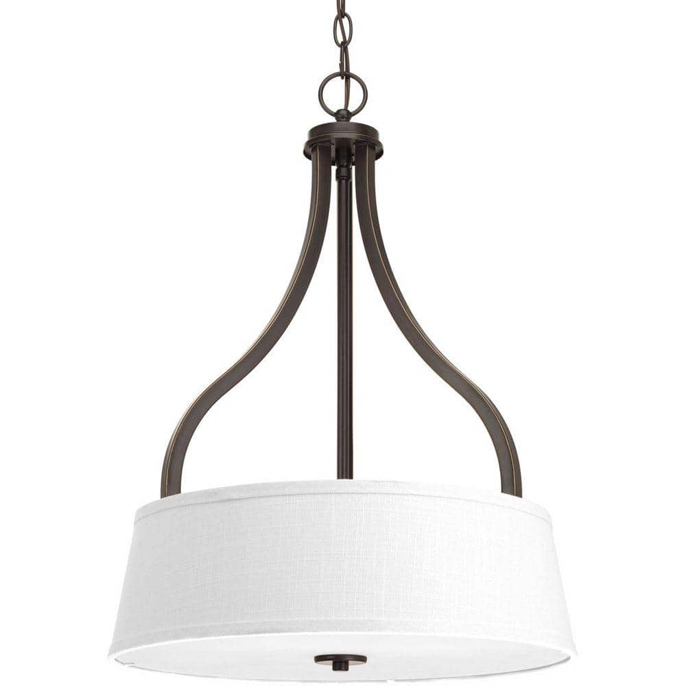 Illuminate your space with the exquisite Arden Collection 3-Light Chandelier from Progress Lighting. Featuring a striking antique bronze finish and summer linen shades, this chandelier harmonizes rustic and modern aesthetics. Its elegant silhouette and robust frame make it a captivating centerpiece for any dining area or living room.