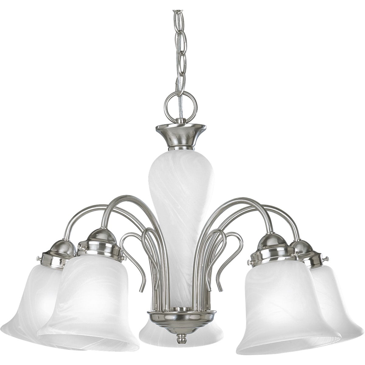 Elevate your living space with the Bedford 5-Light Chandelier from Progress Lighting, a statement piece that blends transitional style with impeccable functionality. Featuring a sleek brushed nickel finish and etched alabaster glass shades, this chandelier provides soft, ambient lighting perfect for dining rooms, kitchens, and more.