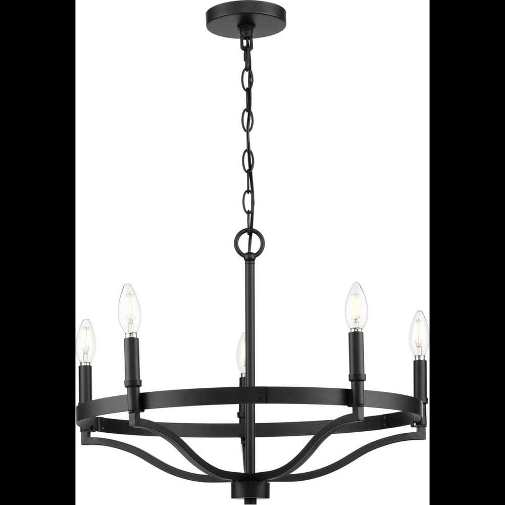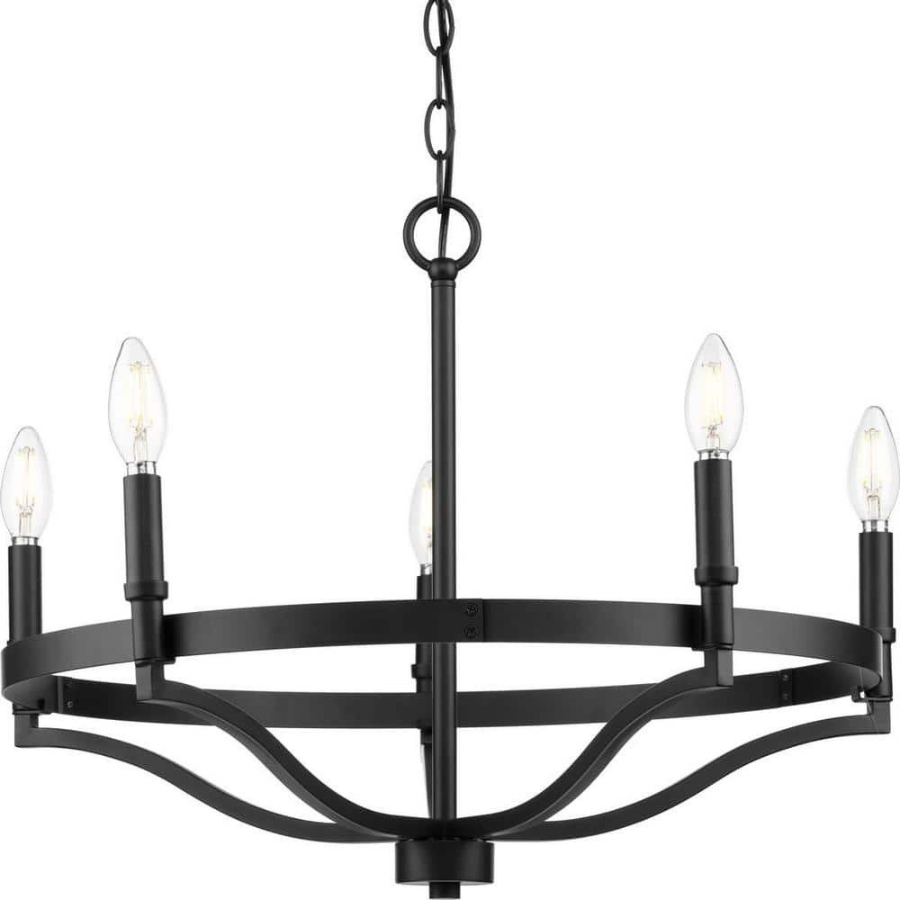 Transform your space with the Canaan 5-Light Chandelier by Progress Lighting, a perfect blend of industrial charm and transitional style. Its robust matte black frame and elegant candelabra bases provide both style and functionality, casting a warm, inviting glow. Ideal for kitchens, dining rooms, or living areas, this piece promises to upgrade any interior with its sophisticated design.