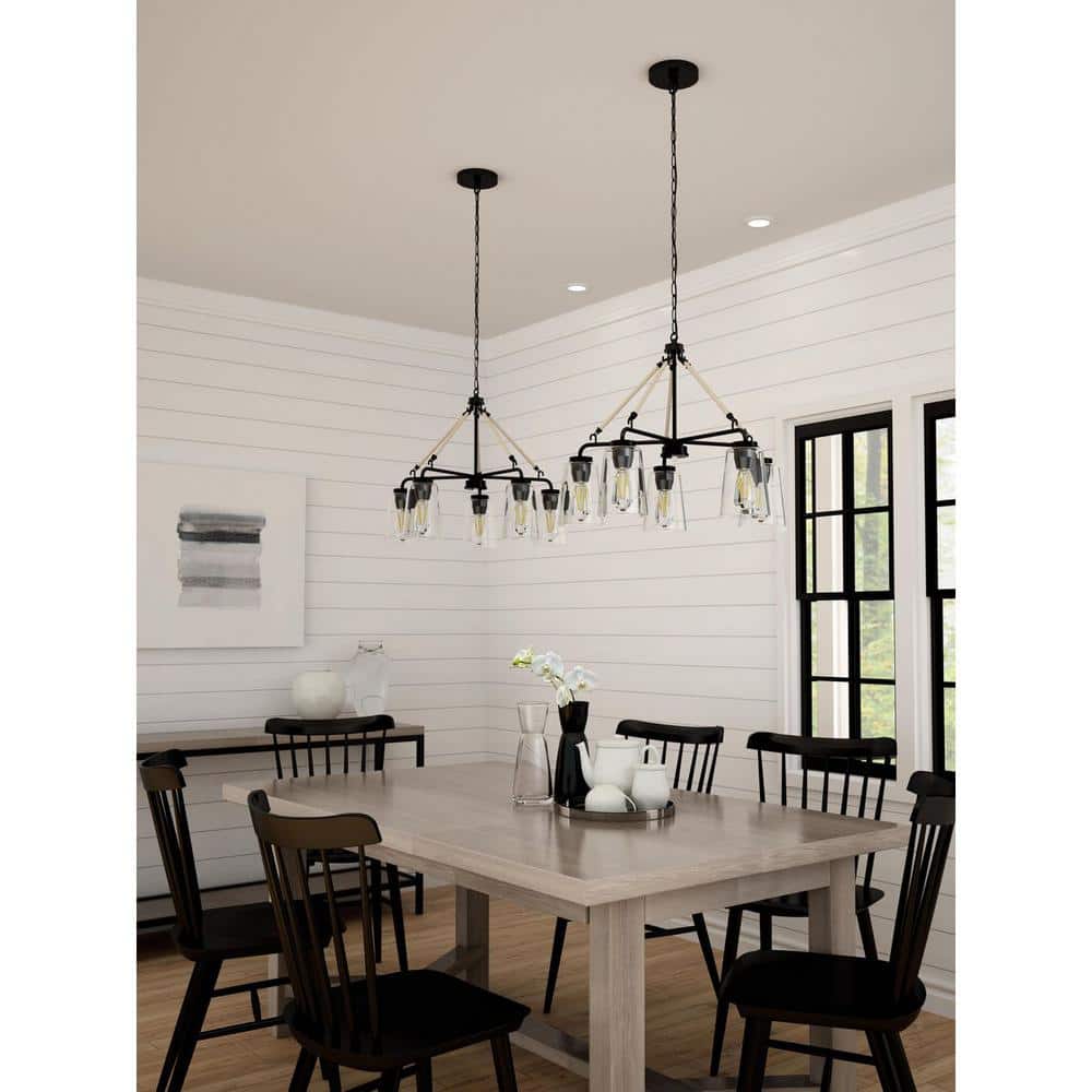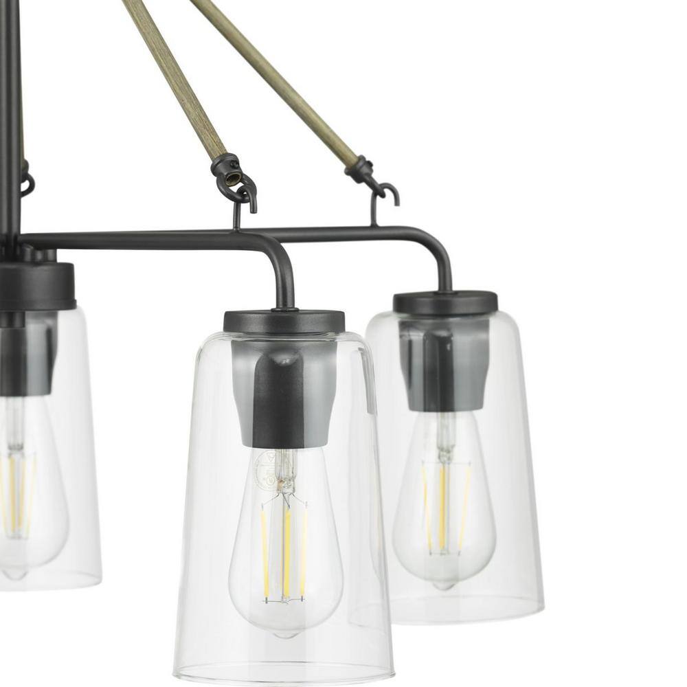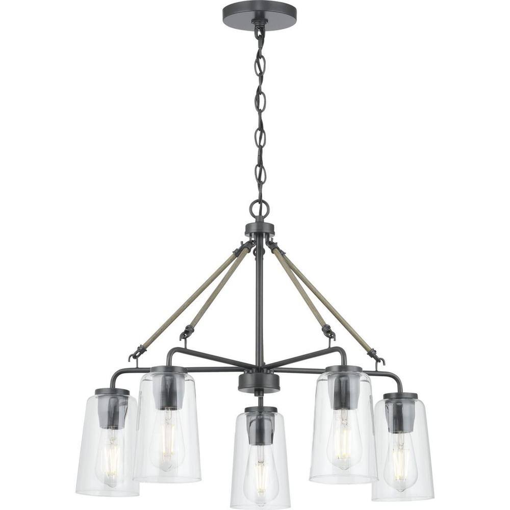 Elevate your space with the rustic charm of the Cashiers 5-Light Chandelier in a striking graphite finish. Its clear glass shades and post-and-beam inspired design create a warm, inviting ambiance, ideal for any living or dining area seeking a touch of refined tradition.
