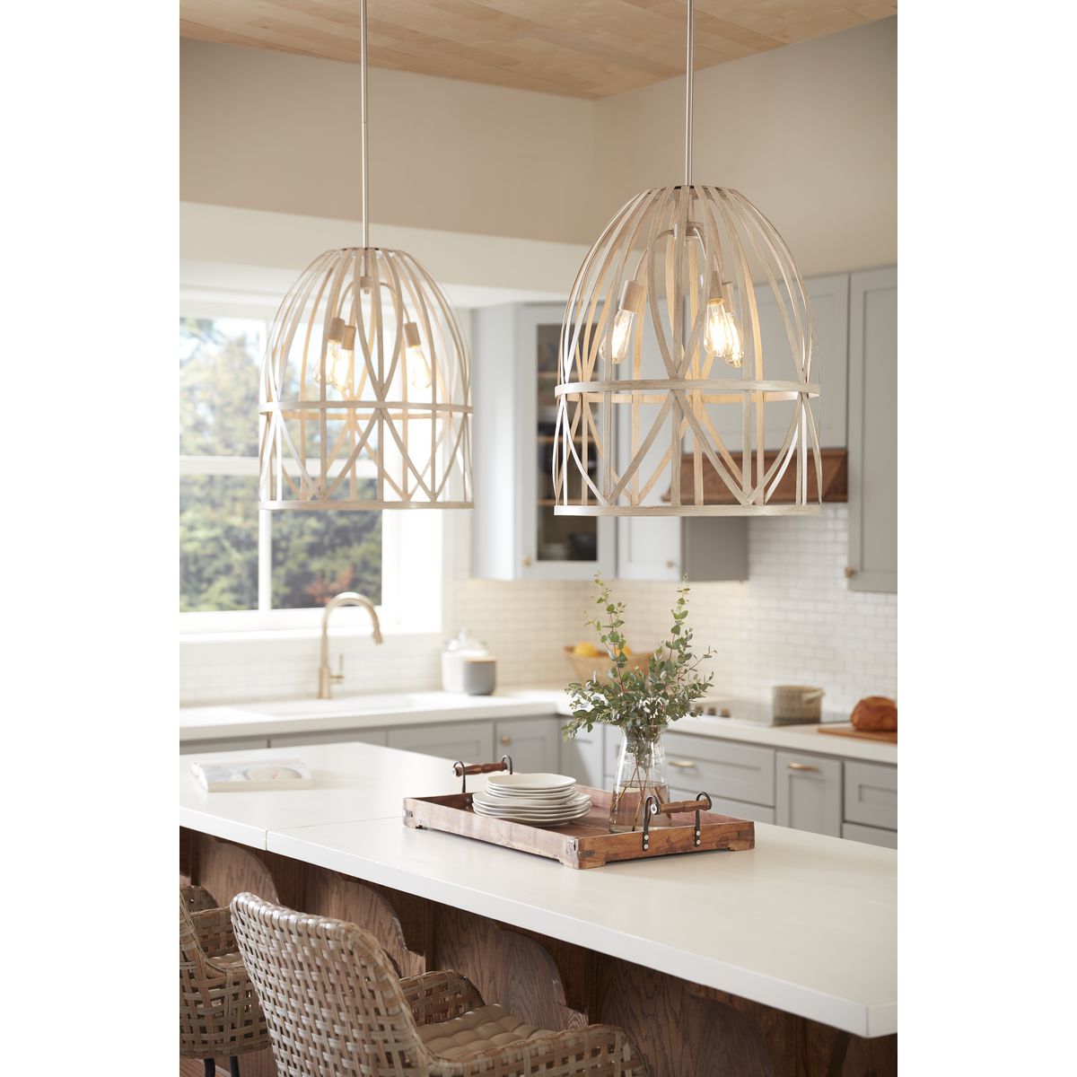 The Chastain pendant light transforms any interior into an enchanting retreat, weaving together the rustic elegance of bleached oak with the sleek polish of brushed nickel. Its cage-like structure evokes the artful simplicity of handwoven baskets, casting alluring shadows that dance with the room’s ambience. Suspend this pendant above your dining table or island to create a focal point that marries casual sophistication with coastal charm. An essential piece, this light fixture elevates your home’s aesthetic to new heights of comfort and luxury.