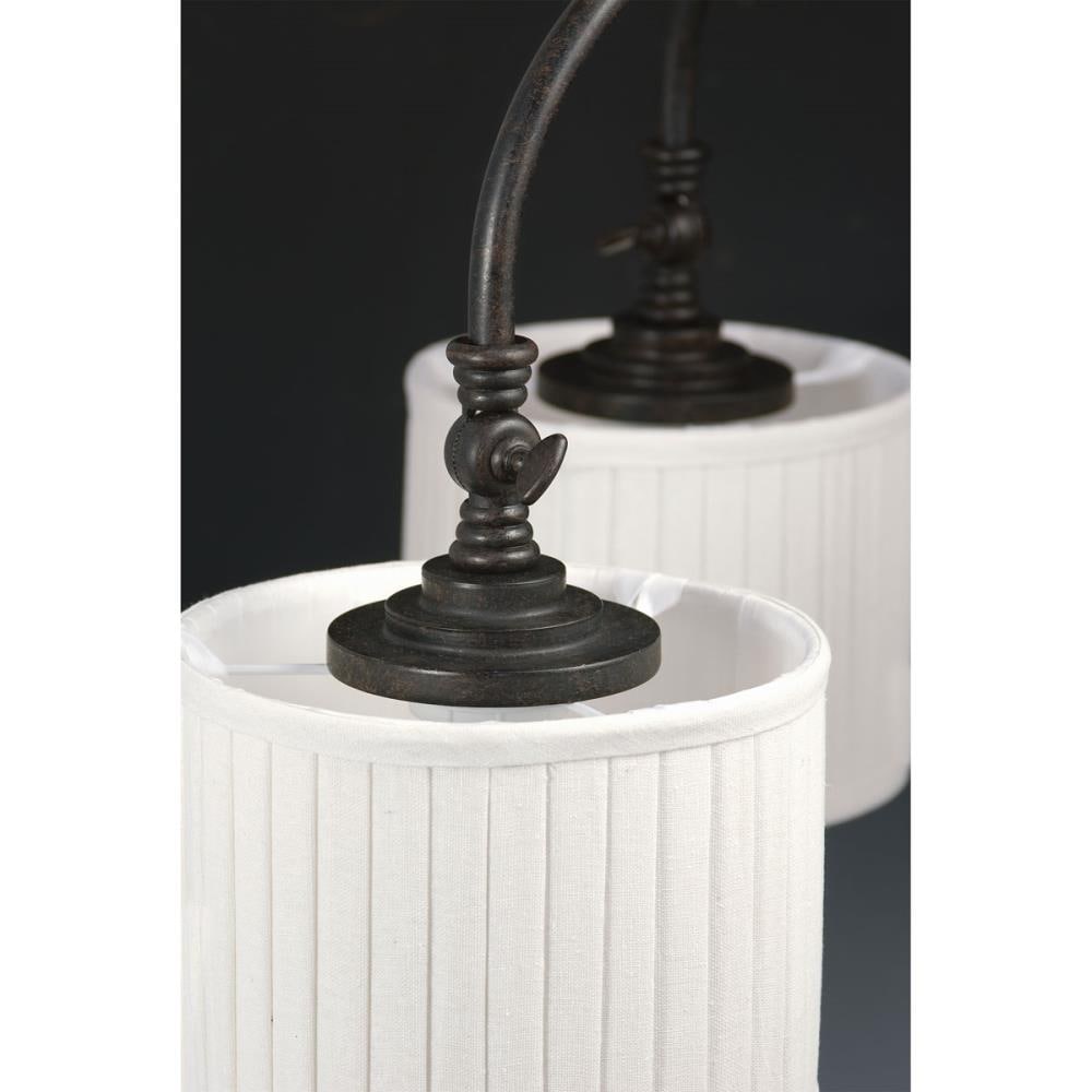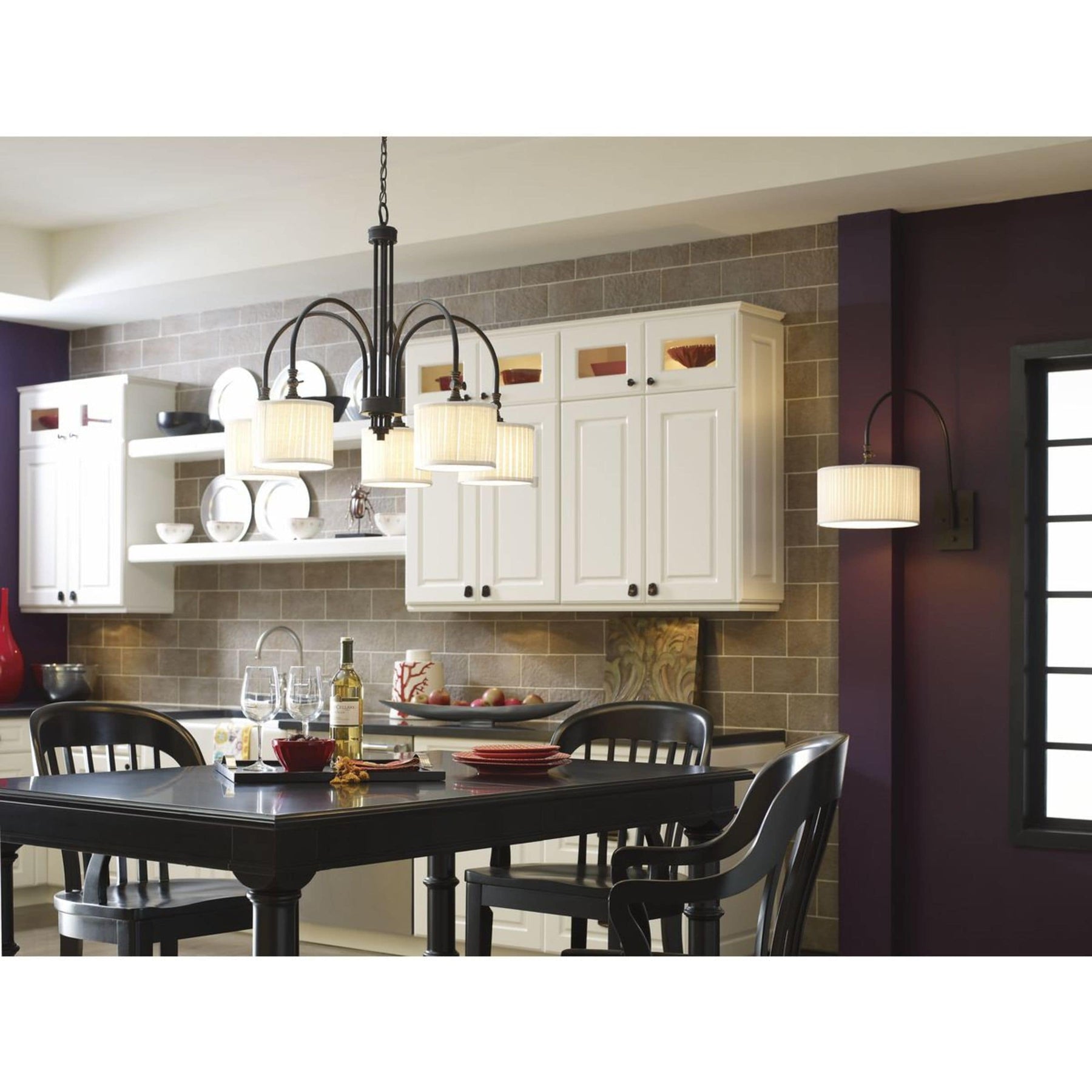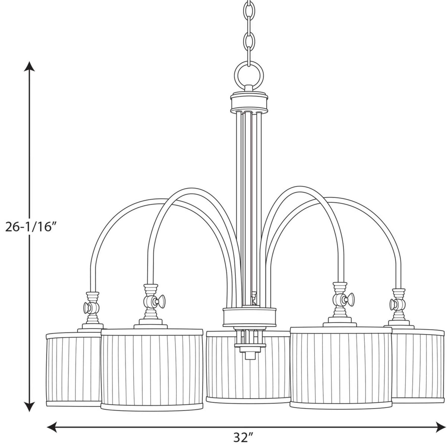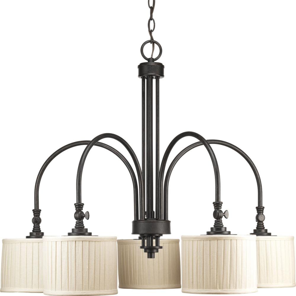 Illuminate your dining or great room with the Clayton 5-Light Farmhouse Chandelier by Progress Lighting. Crafted with a striking espresso finish and cream pleated linen fabric shades, this vintage-inspired chandelier offers adjustable light direction and an adaptable chain for various ceiling heights. It's a perfect blend of classic elegance and modern flair.