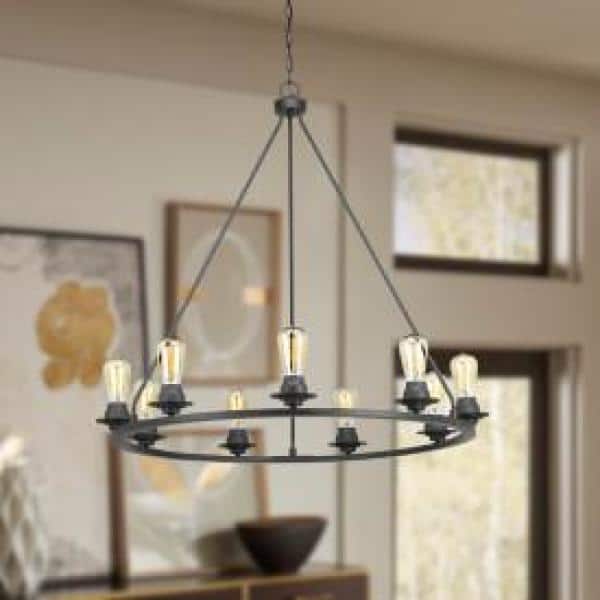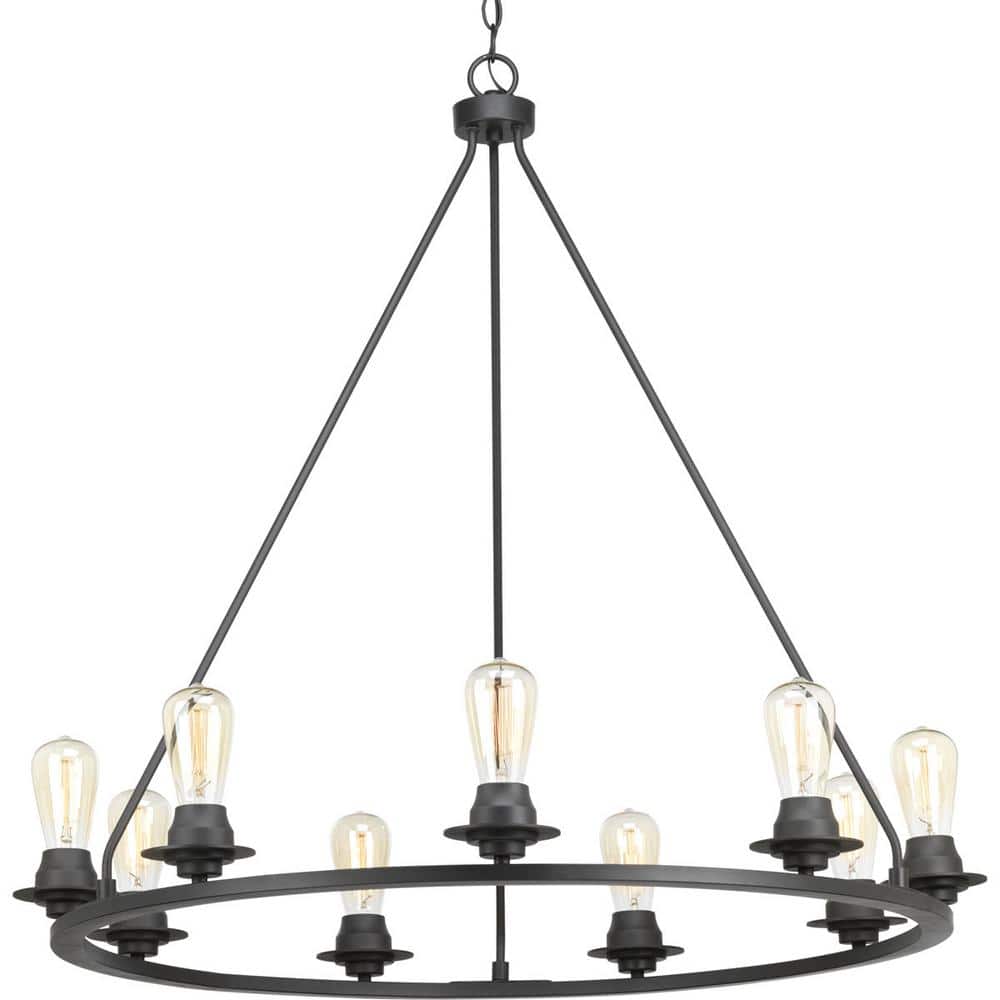 Illuminate your home with the invigorating ambiance of the Debut Collection 9-light chandelier from Progress Lighting. Its bold, graphite-finished circular frame and minimalist design capture the essence of industrial elegance, making it a striking centerpiece for modern interiors. Perfect for enhancing any dining room, foyer, or great room, this chandelier is a versatile and sophisticated addition to your home lighting.