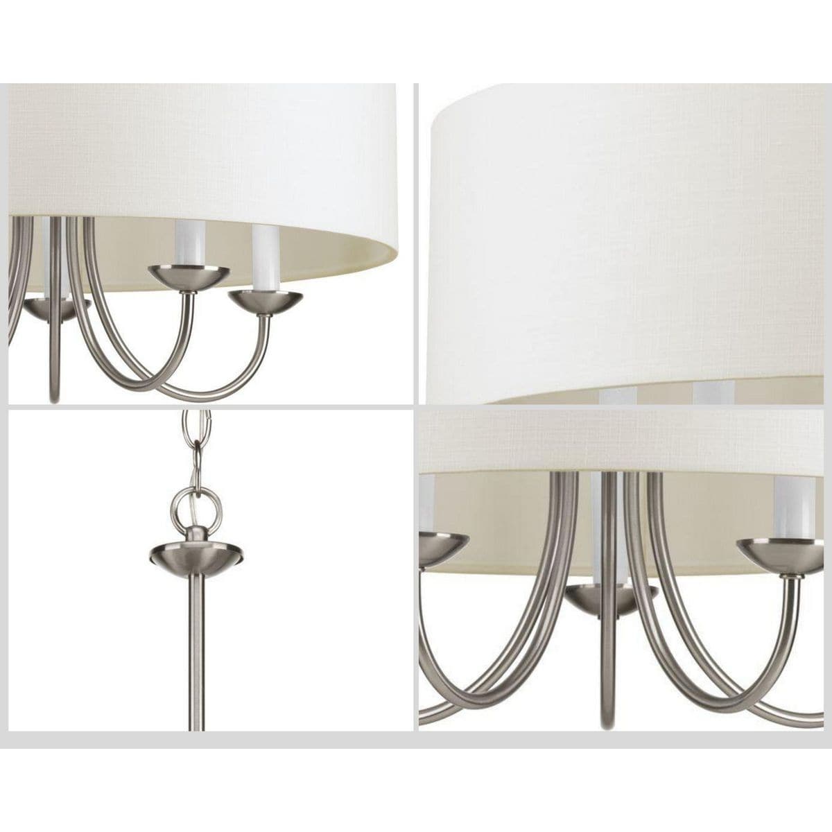 The Progress Lighting Drum Shade 5-Light Chandelier features a brushed nickel finish that offers a touch of modern elegance to any room. Its five light sources radiate through a crisp white linen shade, providing a soft, welcoming glow. Perfectly blending transitional style with functionality, this chandelier is a statement piece for the kitchen, dining room, or living room.