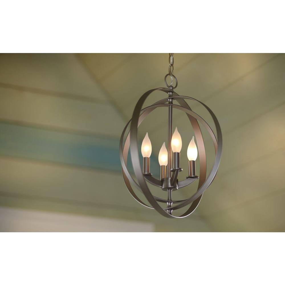 A: The Equinox Orb Pendant uses four 60-watt candelabra base bulbs, compatible with both incandescent and LED options.