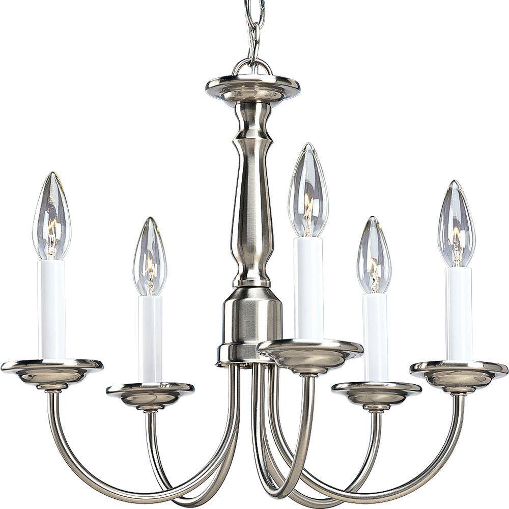 Progress Lighting Five-Light Brushed Nickel White Candles Traditional Chandelier Light