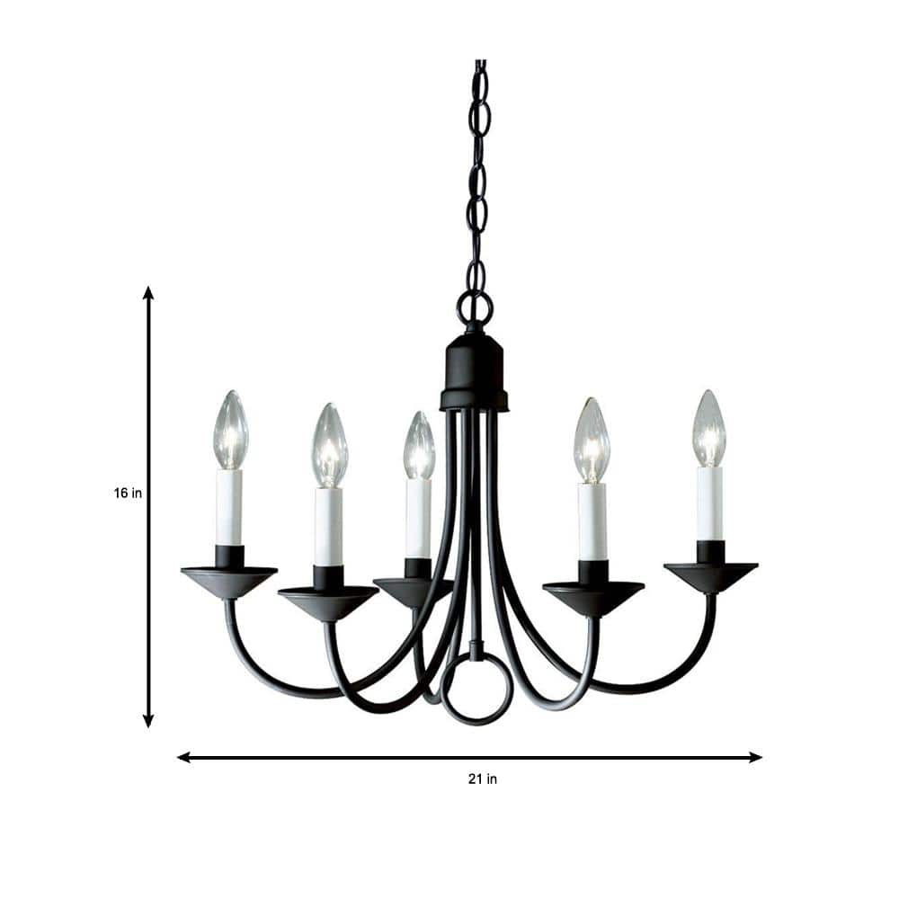 Bring traditional elegance to your home with the Progress Lighting Five-Light Black Chandelier. Its timeless candle design enhances classic interiors with ambient lighting suitable for dining rooms, foyers, and living areas. Crafted with a durable black textured metal finish and graceful white candle sleeves, it provides a sophisticated touch to any setting.