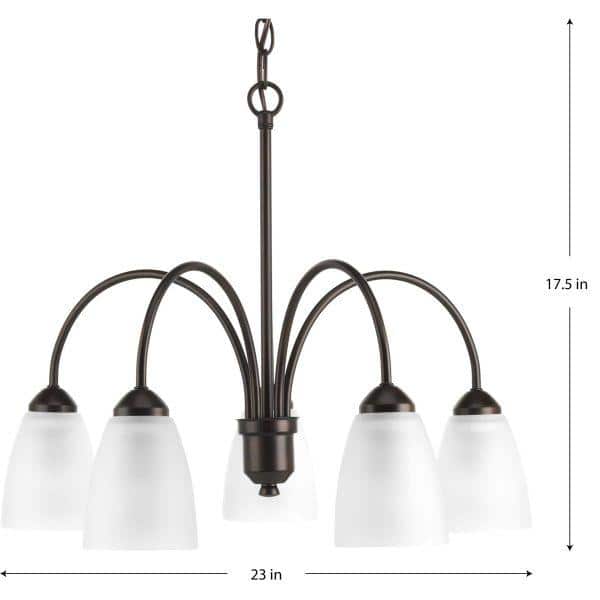Illuminate your home with the timeless elegance of the Progress Lighting Gather Collection 5-Light Chandelier. Featuring a sophisticated antique bronze finish and elegant etched glass shades, this chandelier brings a harmonious blend of classic design and contemporary simplicity to your space. Ideal for dining rooms, foyers, or living areas, it offers ample lighting with five medium-base bulbs.