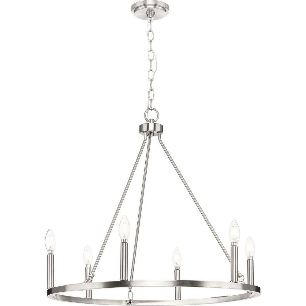 Illuminate your space with the classic elegance of the Gilliam 6-Light Brushed Nickel Chandelier. Perfectly blending traditional charm with modern farmhouse flair, this chandelier casts a soft ambient glow that's ideal for dining rooms, great rooms, or entryways. Its brushed nickel finish adds a timeless allure, fitting effortlessly in diverse décor styles.