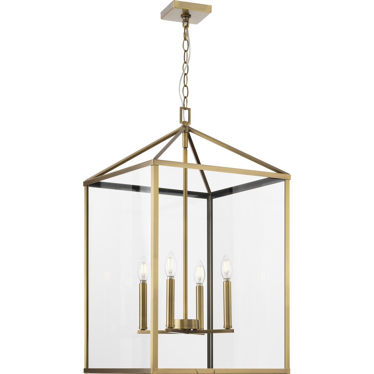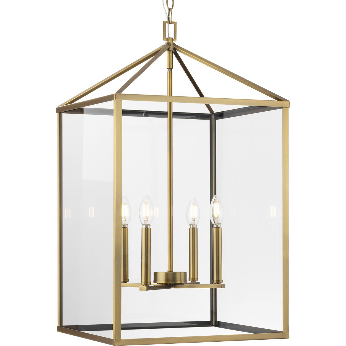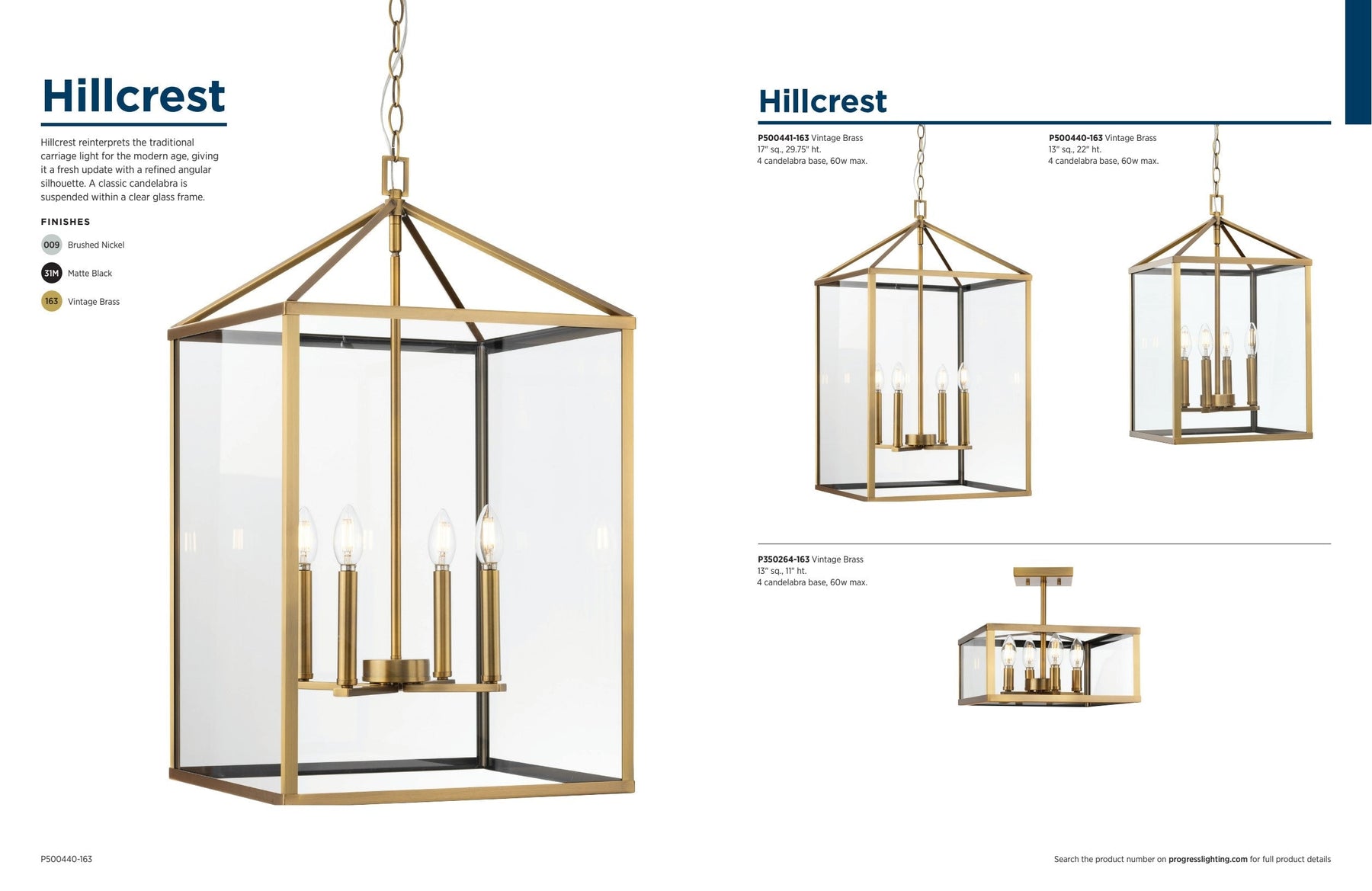 Illuminate your space with the Hillcrest 4-Light Chandelier, where transitional design meets modern farmhouse charm. Featuring a classic candelabra base encased in clear beveled glass, this chandelier elevates any room with its vintage brass finish.