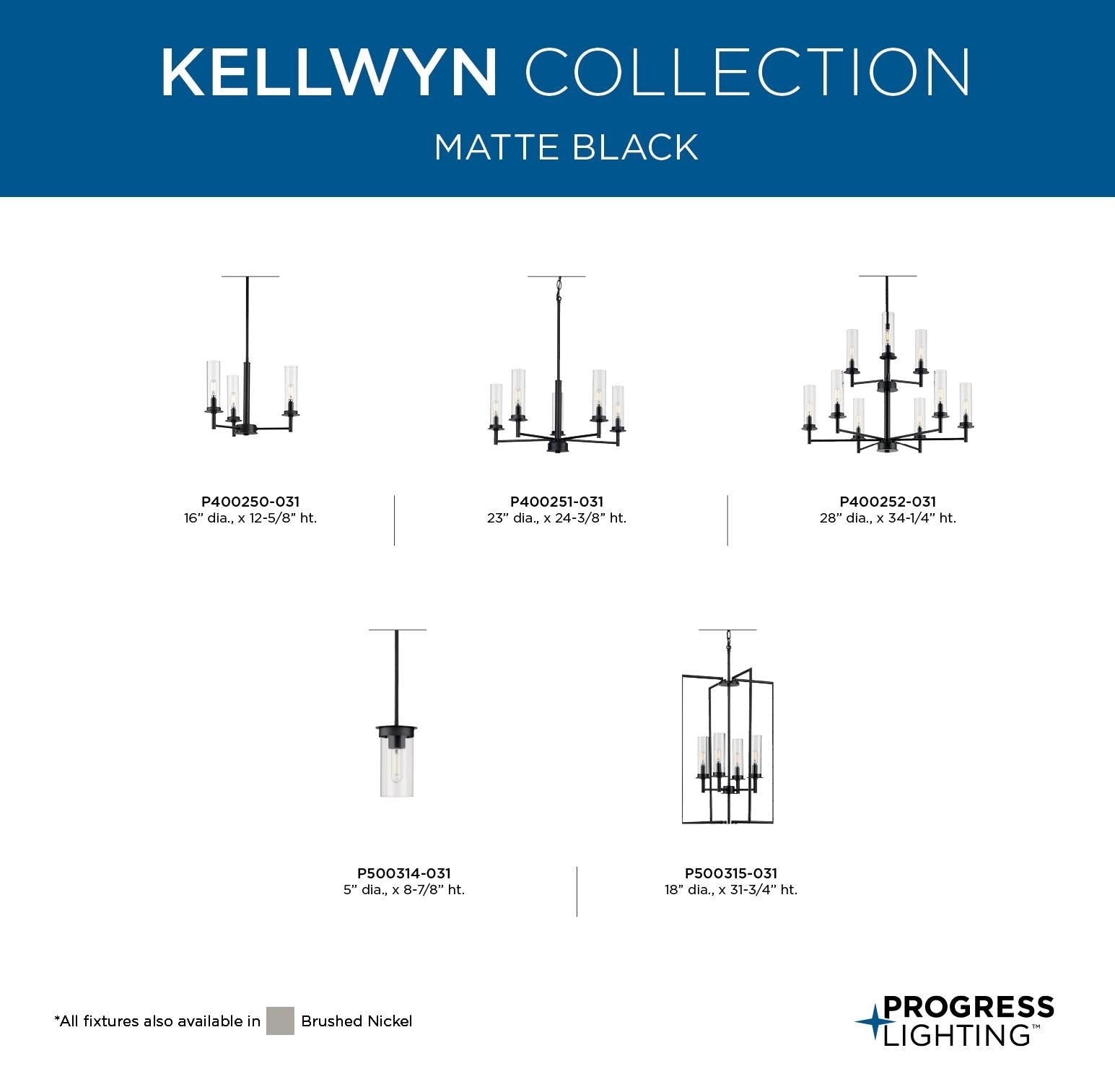 Elevate any room's ambiance with the Kellwyn 5-Light Matte Black Chandelier from Progress Lighting. This fixture blends modern elegance with traditional charm, featuring a classic frame and luxurious cylindrical glass shades. Ideal for transitional spaces, this chandelier provides both high-quality illumination and lasting style.