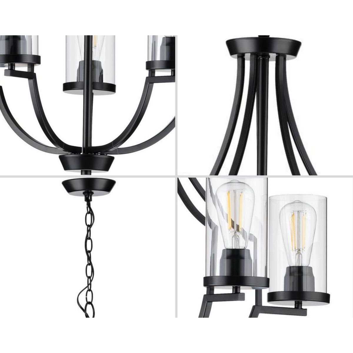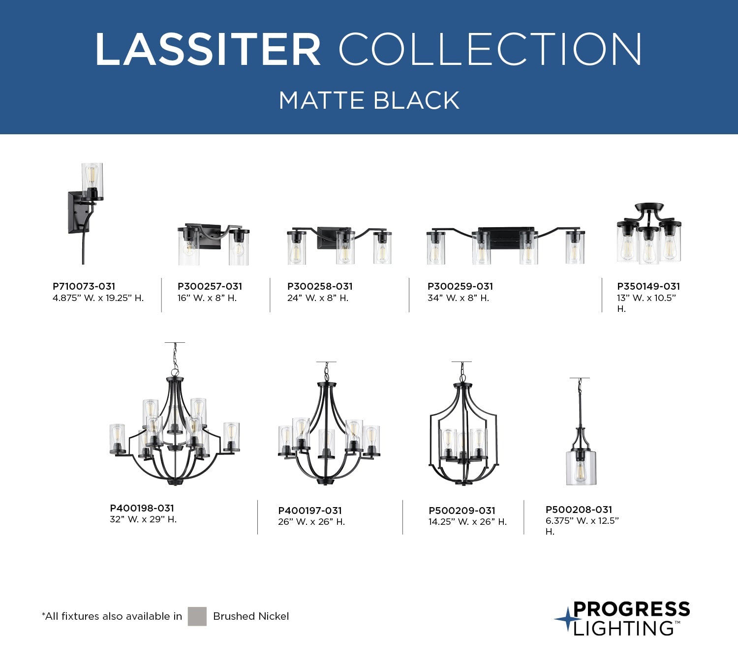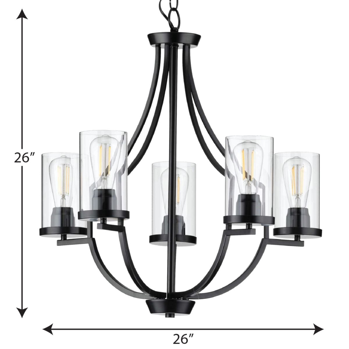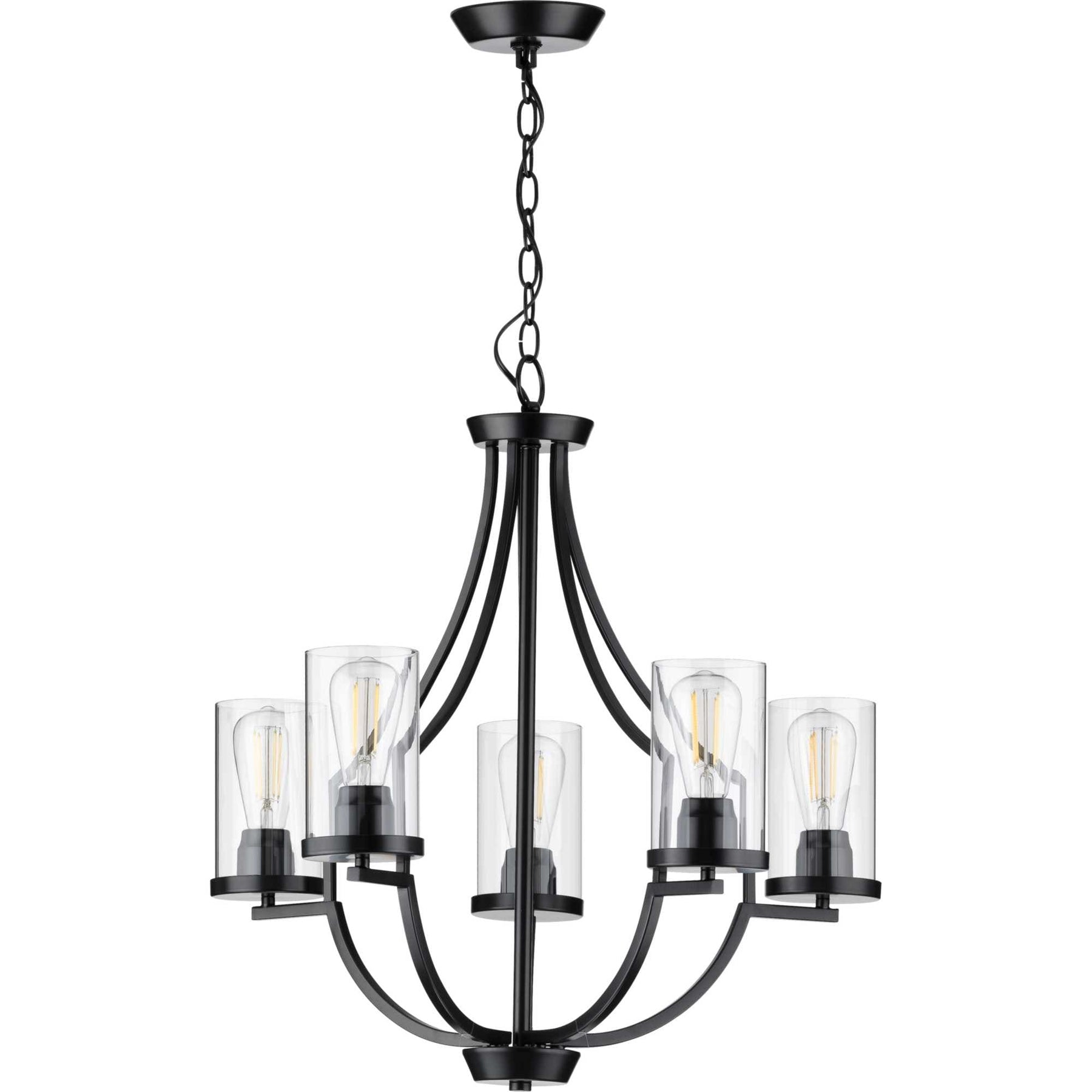 Elevate the ambiance of any room with the Lassiter 5-Light Matte Black Chandelier from Progress Lighting. This captivating fixture merges modern and traditional styles with its bold matte black finish and crisp clear glass shades. Perfect for dining rooms, kitchens, and foyers, it adds a touch of sophisticated elegance to your decor.