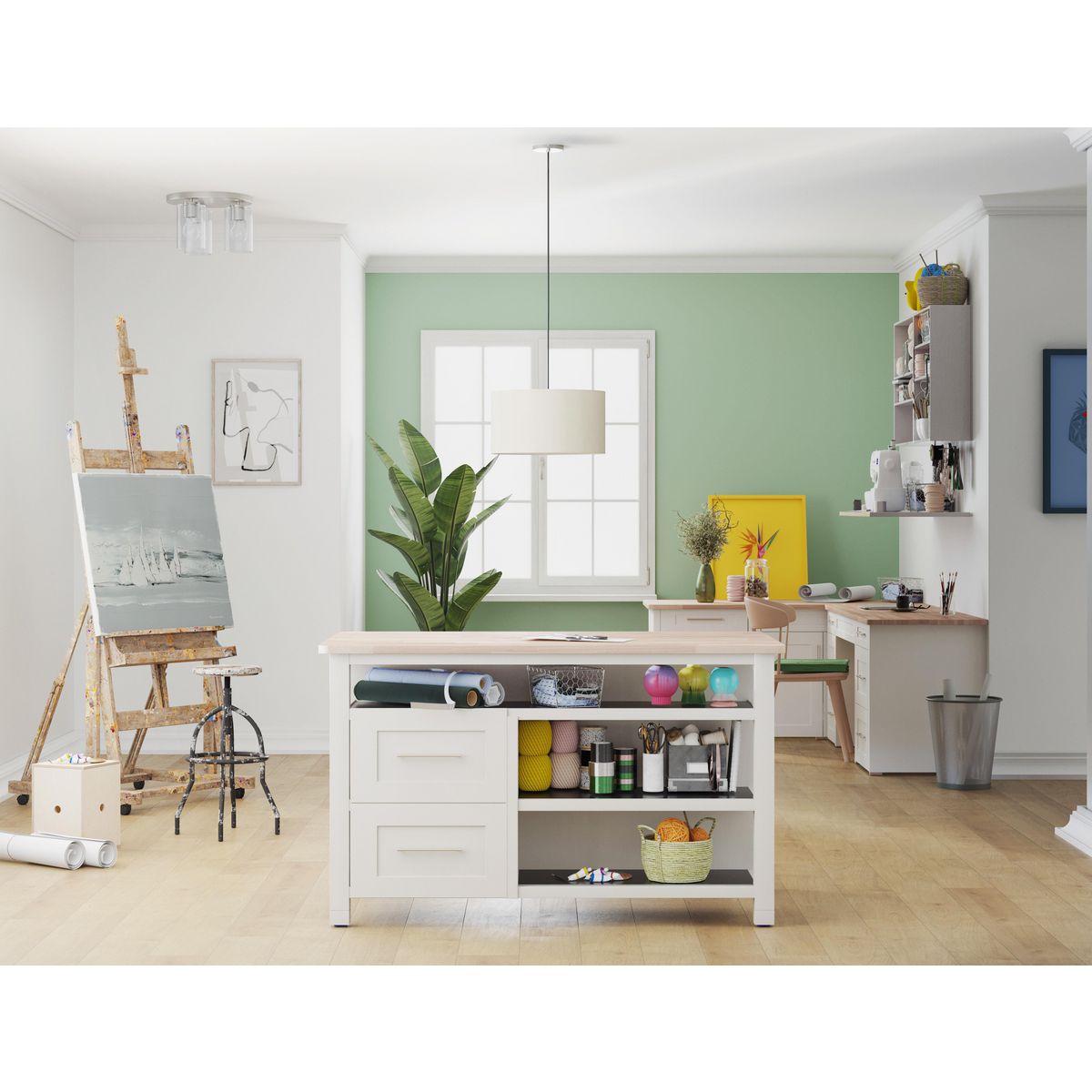• Soft Ambient Lighting: Ecru linen drum shade combined with a diffuser creates an inviting, glare-free glow.