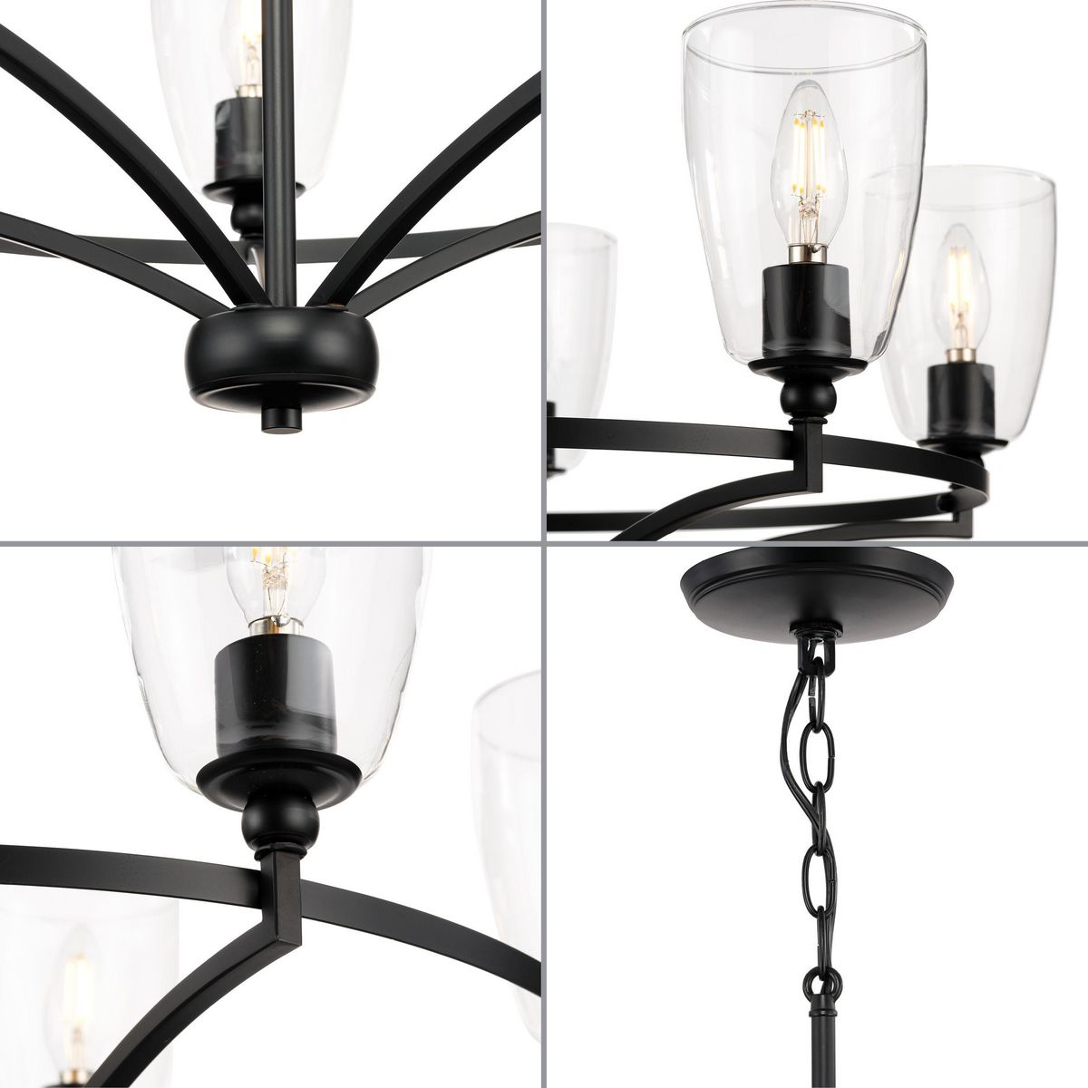 In the artful composition of your living space, let the Parkhurst Chandelier be the centerpiece, elevating everyday moments with its delicate dance of light and shadow. Its matte black finish juxtaposes perfectly with clear glass shades, creating an intriguing visual harmony. Envision it suspended above a rustic wooden dining table, the room imbued with warm, inviting luminance. This chandelier is not just a lighting fixture; it’s an essential embodiment of elegance that transforms any space into a sanctuary of style.