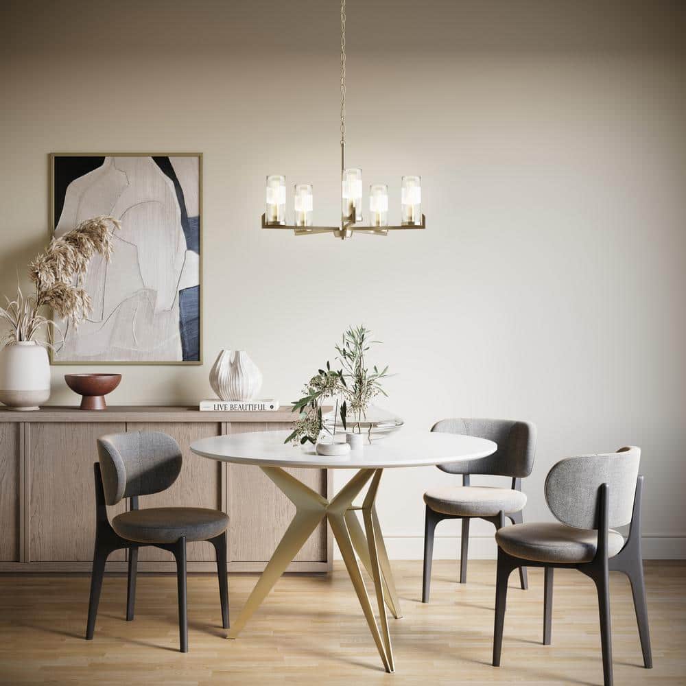 The Pellum Collection Chandelier is a masterstroke of elegance, casting a warm ensemble of light throughout your space. Its brushed gold finish delicately frames the banded textured glass shades, transforming your dining room into a haven of modern sophistication. Hang it in your breakfast nook to create a glowing conversation starter that echoes timeless charm. Let this chandelier be the beacon of luxurious living that enriches your home’s aesthetic.