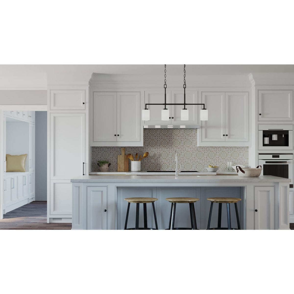 The Rexington 4-Light Matte Black Kitchen Island Light from Progress Lighting brings a sleek modern touch to any space with its elegant square profile and etched glass shades. Ideal for kitchens, dining areas, or any contemporary interior, it adds sophisticated illumination while allowing easy customization with adjustable heights.