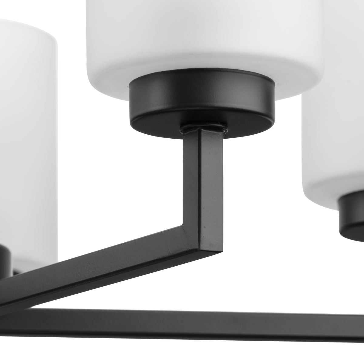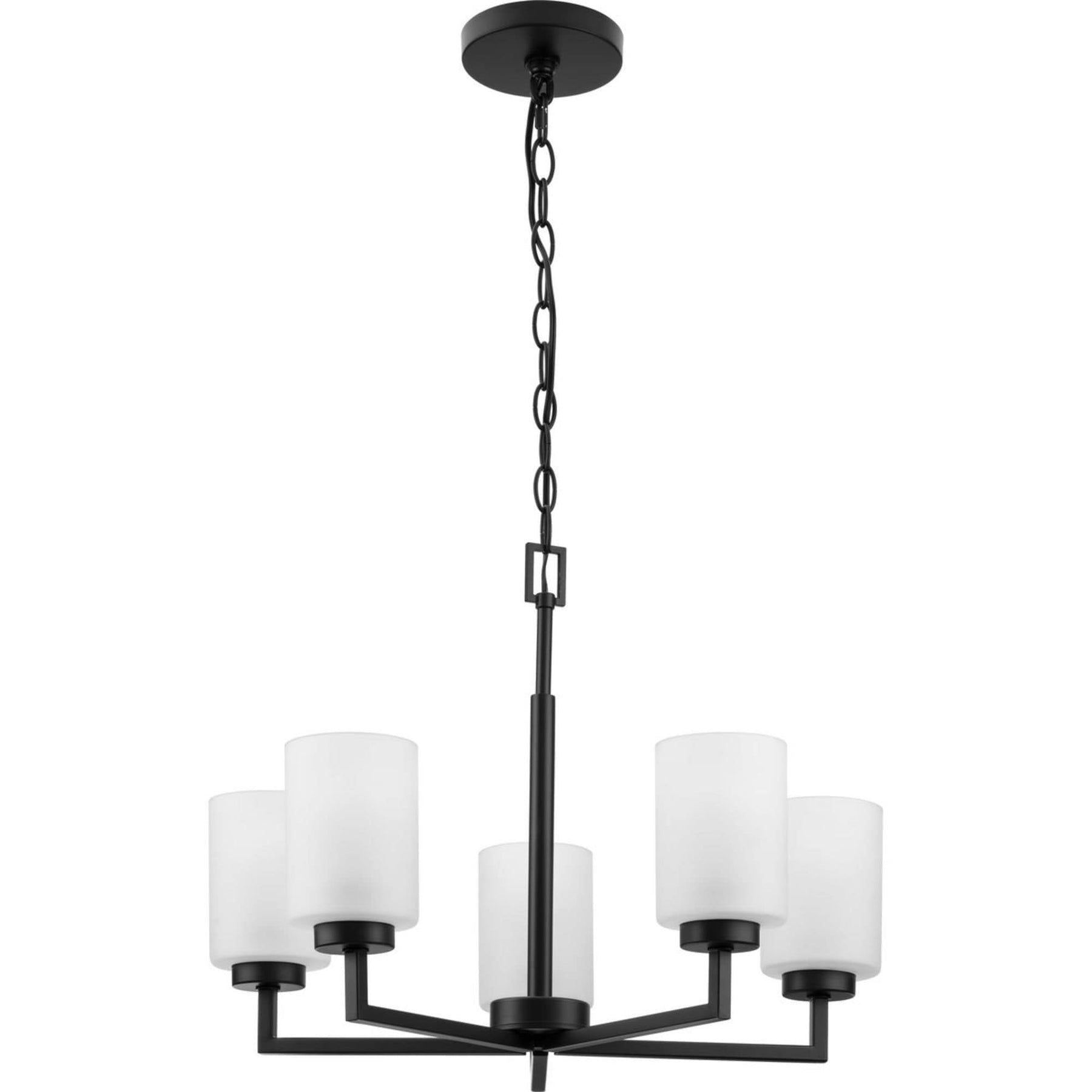 Infuse contemporary elegance into your space with the Progress Lighting Rexington 5-Light Matte Black Chandelier. Featuring sleek mitered arms and sophisticated etched glass shades, this fixture offers versatile, gentle illumination for dining rooms, kitchens, and more. Its adjustable chain allows for customized hanging height, making it a perfect fit for various ceiling styles.