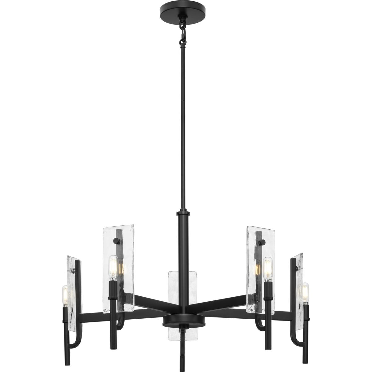 Transform your living space with the Rivera 5-Light Matte Black Craftsman Chandelier by Progress Lighting. This stunning fixture combines modern farmhouse aesthetics with urban industrial flair, featuring linear black elements and clear, textured glass for a soft, ambient glow. Perfect for dining rooms, great rooms, and living spaces, it's a functional work of art that enhances any interior.