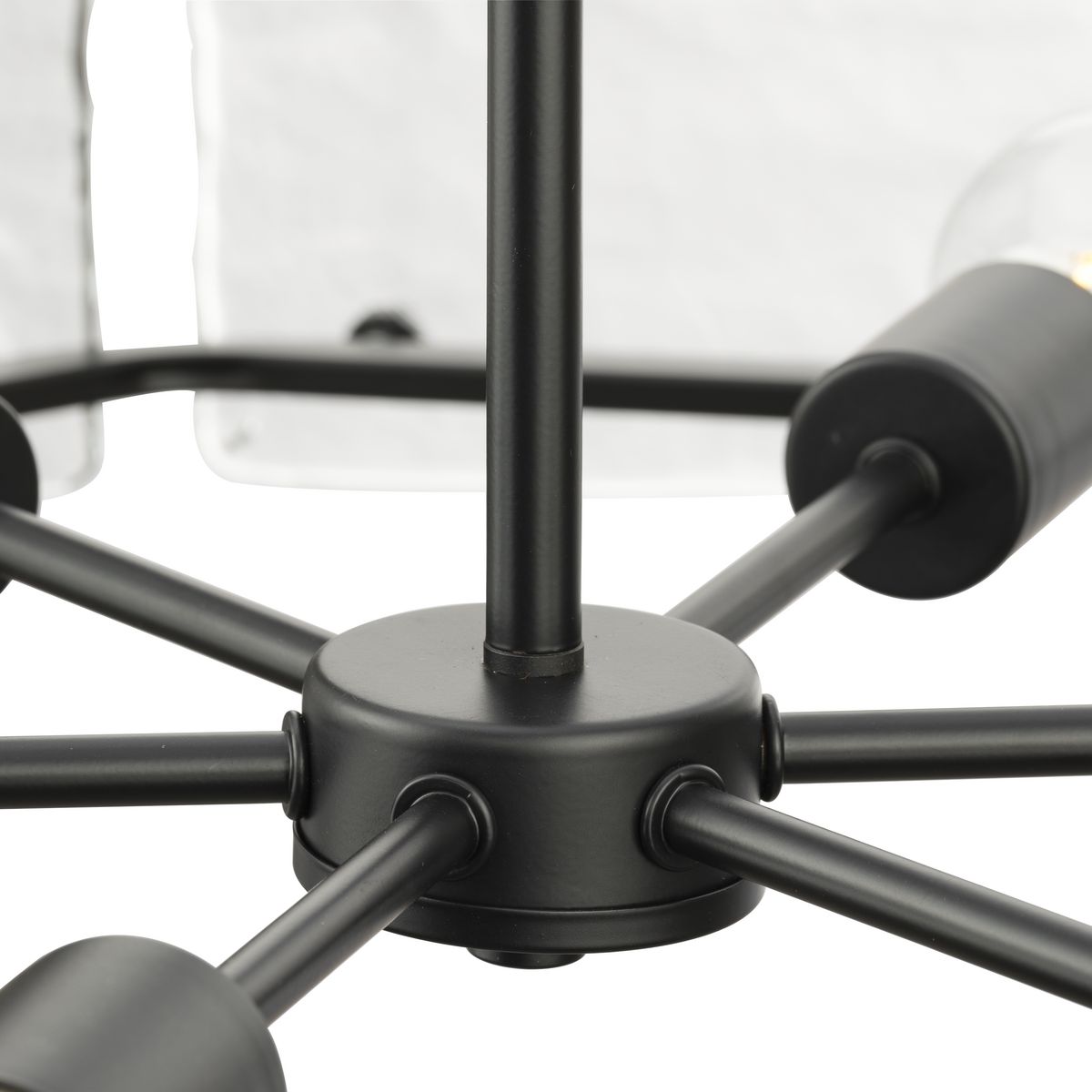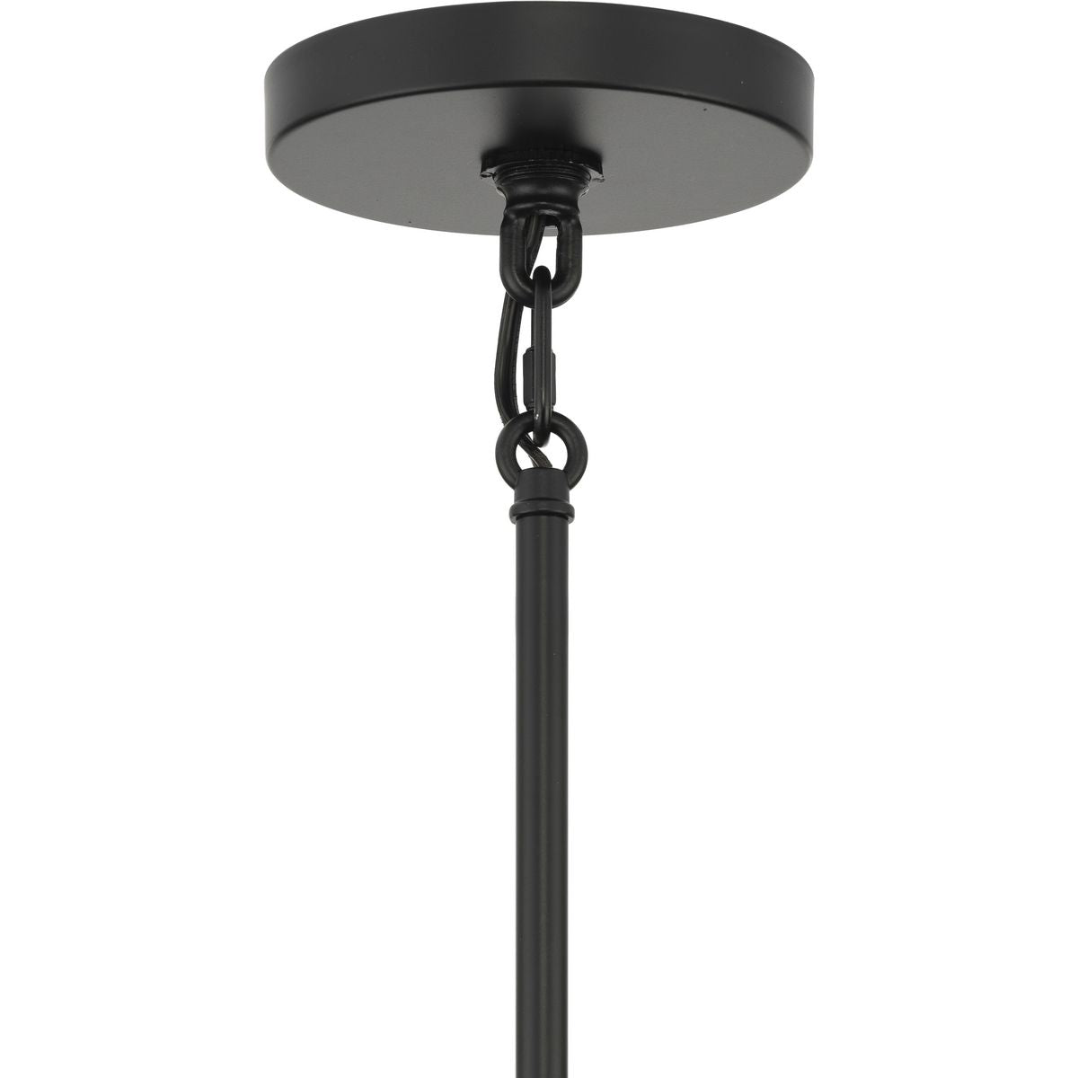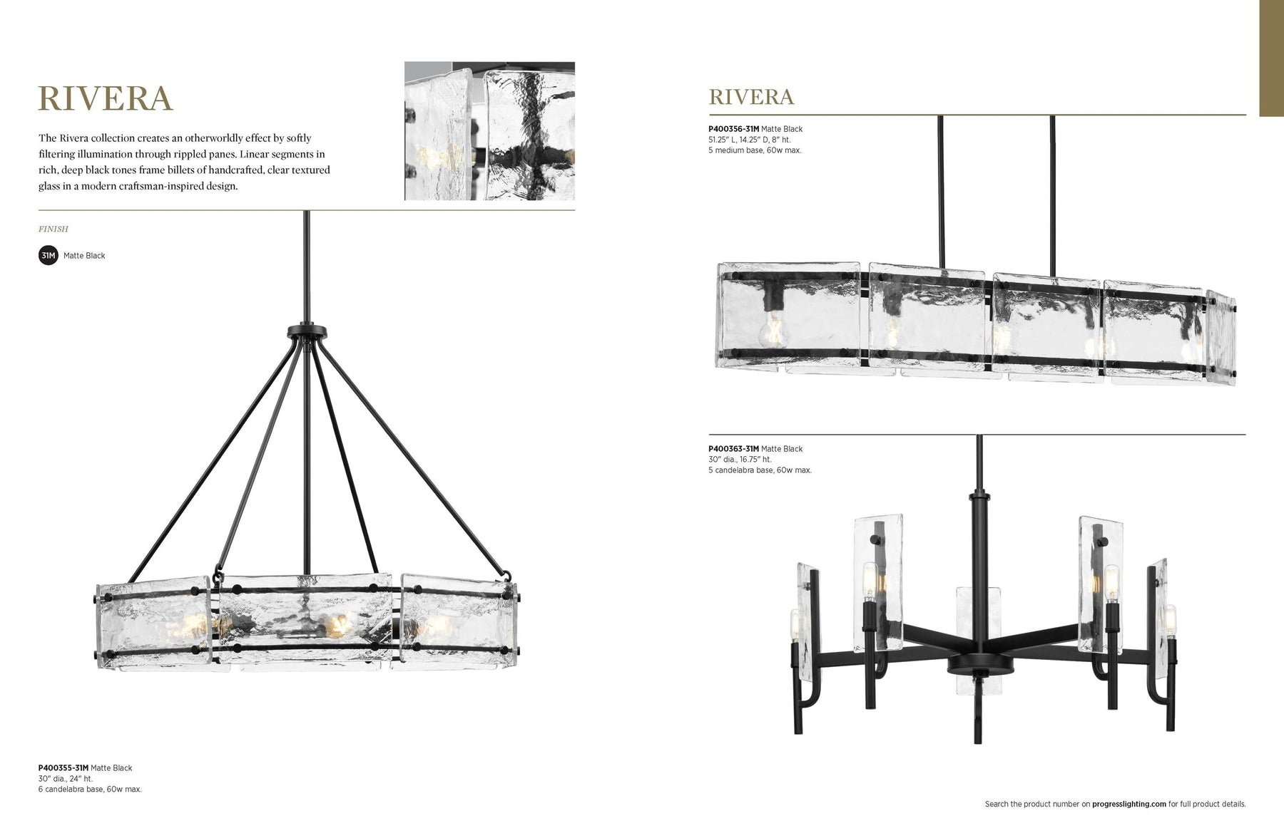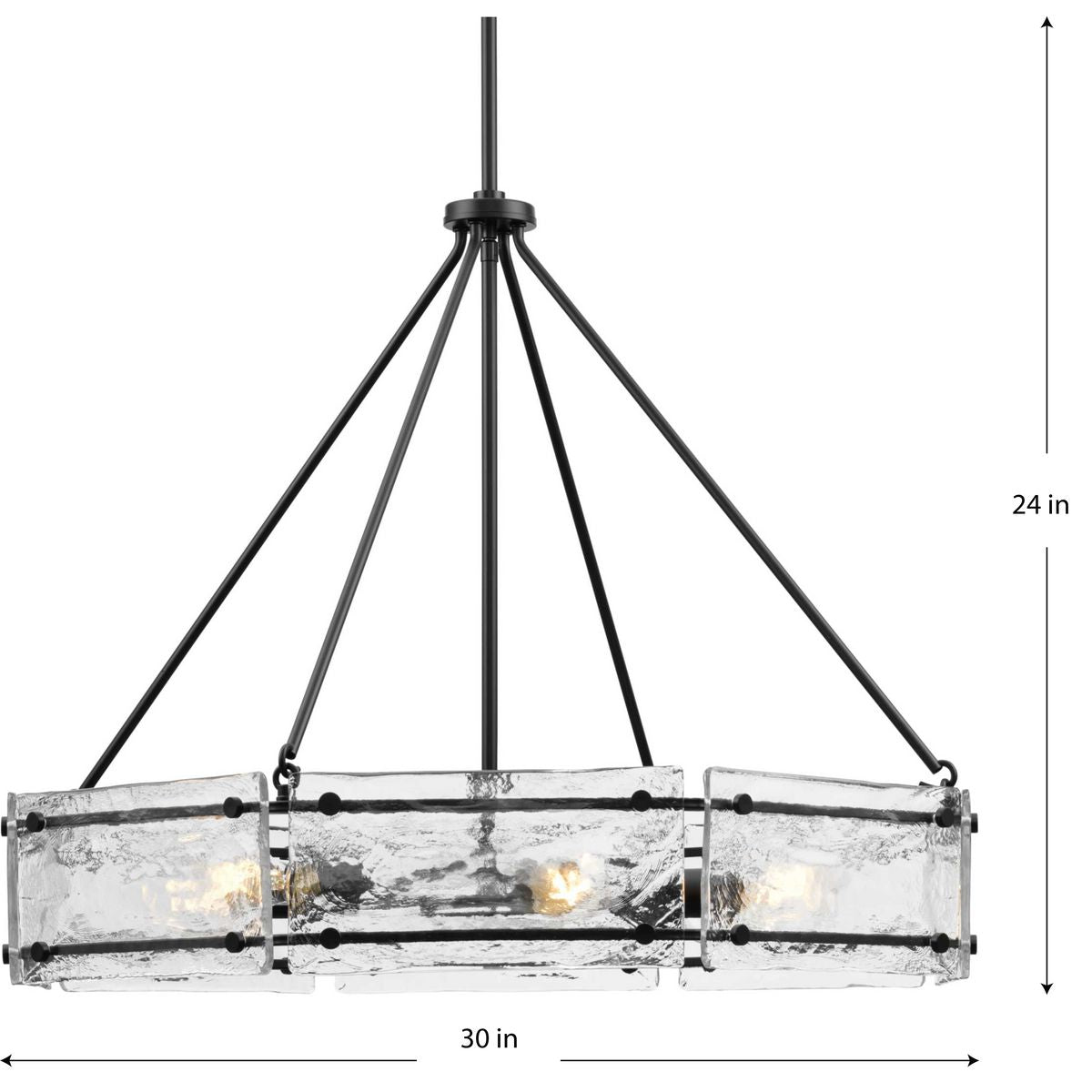 The Rivera 6-Light Matte Black Craftsman Chandelier from Progress Lighting introduces a sophisticated blend of industrial and craftsman styles to your space. Its clear, textured glass provides ambient illumination, casting a warm glow in any room, perfect for dining rooms, great rooms, or bedrooms. Finished in matte black, this stunning chandelier is both functional and an eye-catching centerpiece.