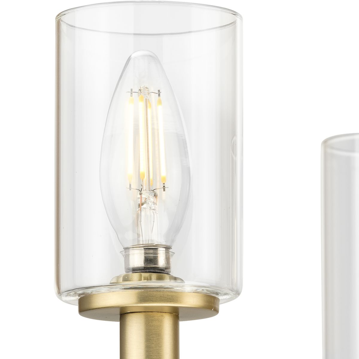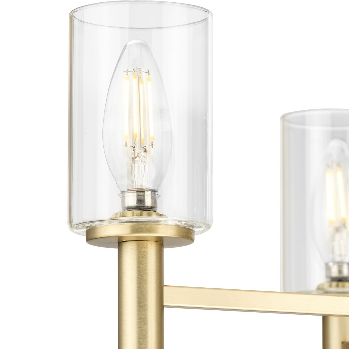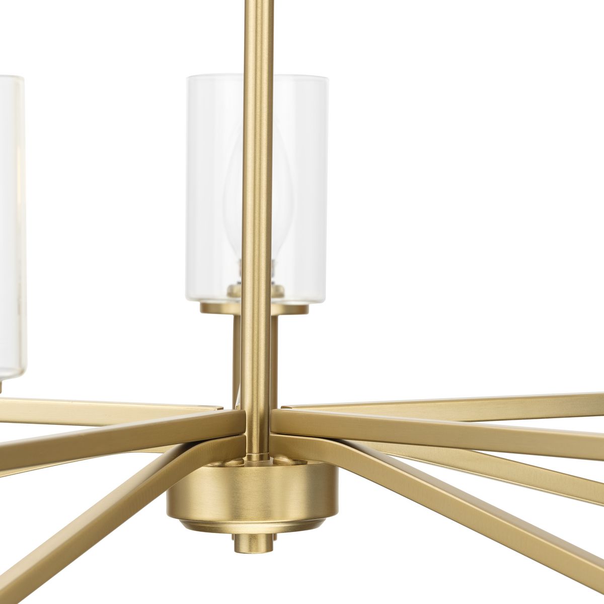 Enhance your spaces with the Roxobel 5-Light Brushed Gold Chandelier, a perfect blend of modern elegance and functionality. With its geometric design featuring angular bars and clear glass shades, it offers a stunning aesthetic while providing bright, ambient illumination for dining rooms, foyers, and more.