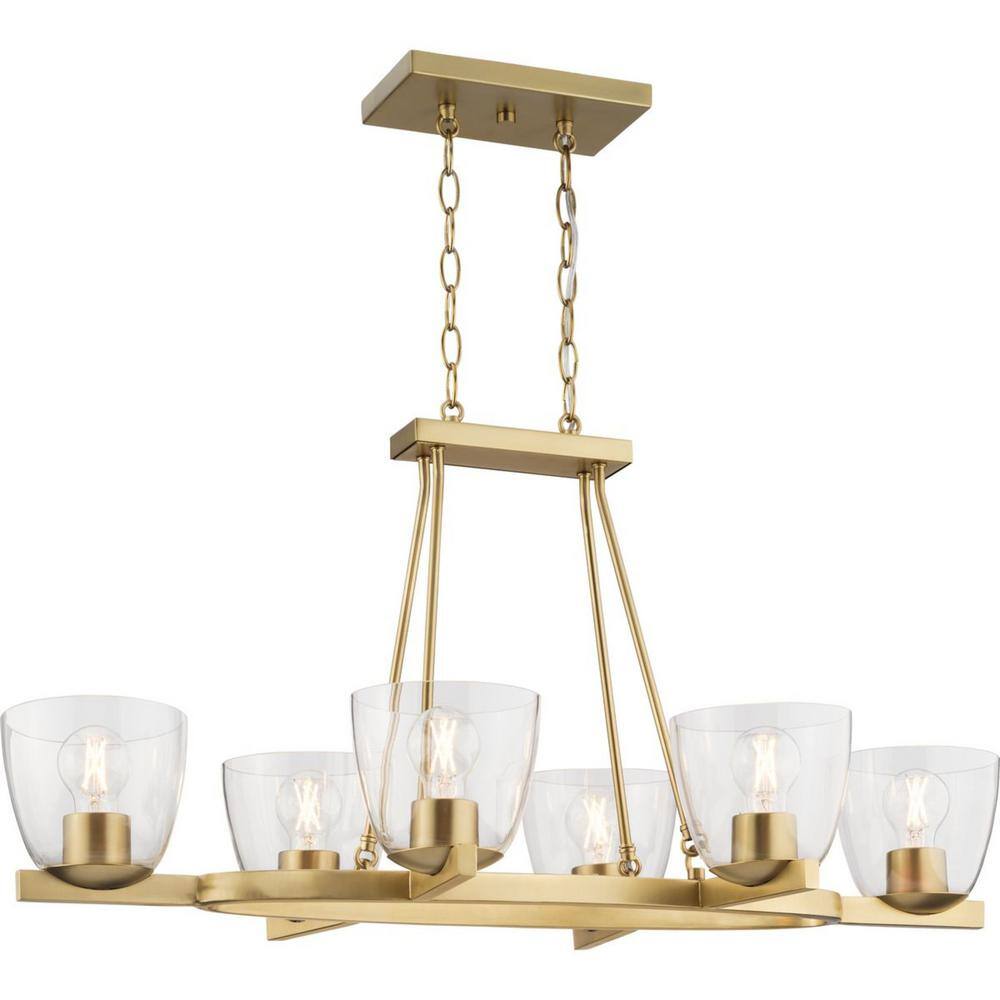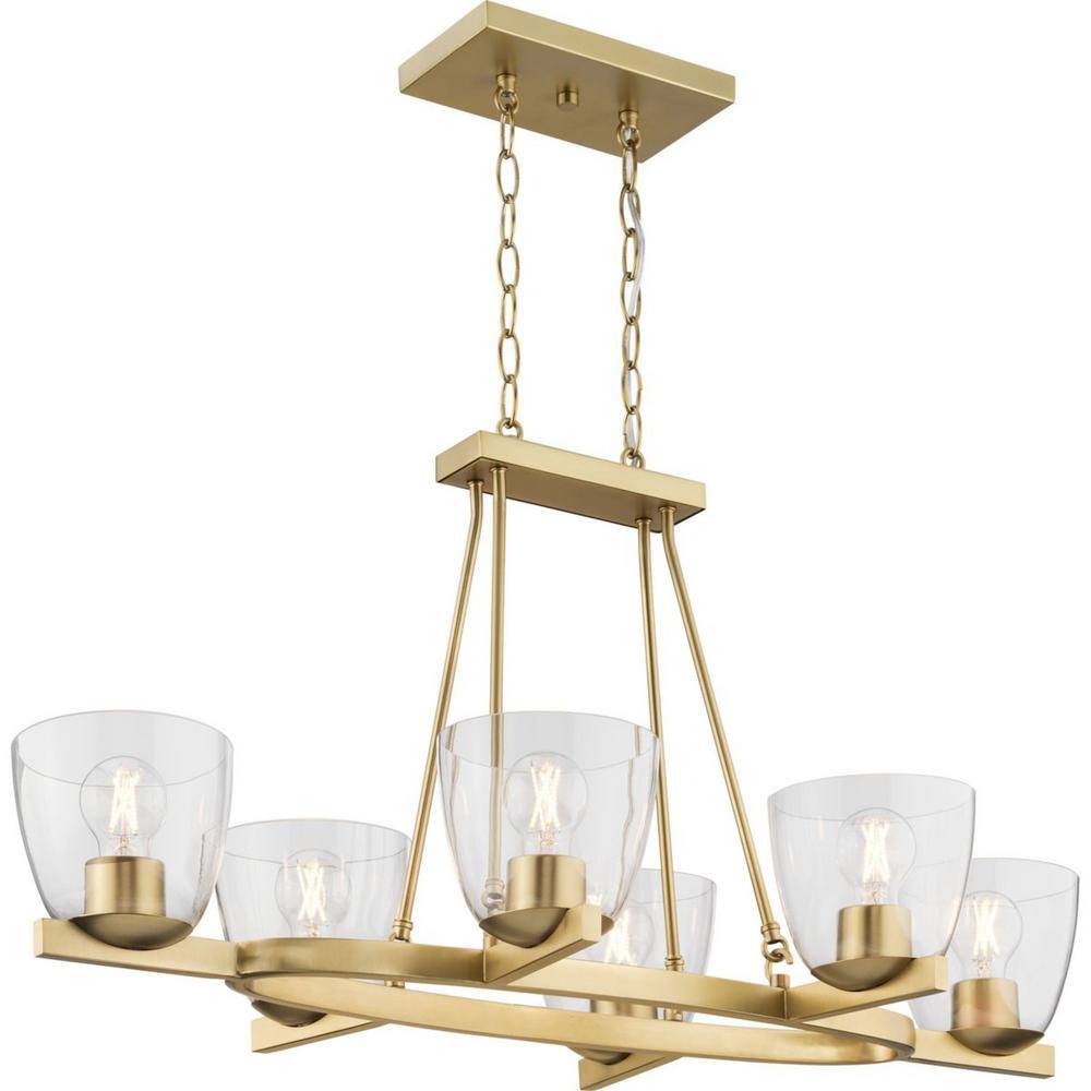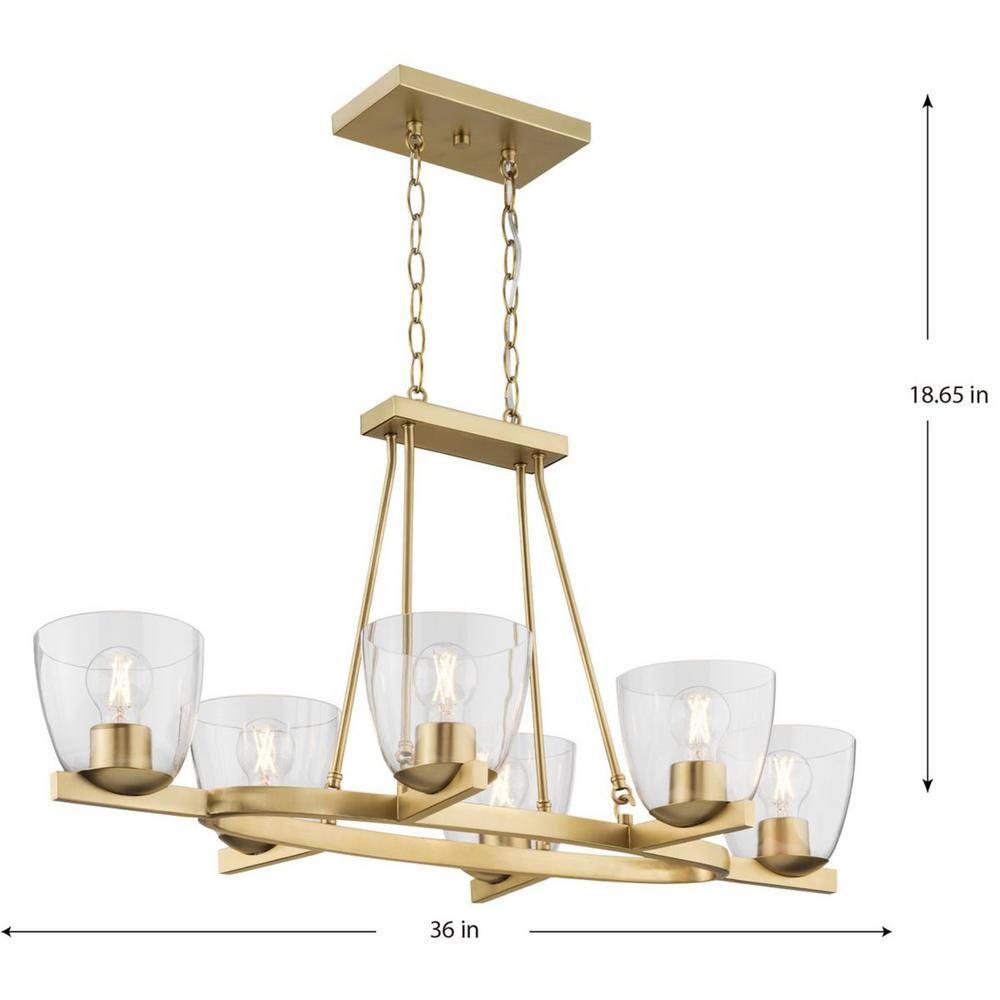 Progress Lighting Tamassee Collection 6-Light Brushed Gold Updated Traditional Linear Chandelier with Clear Glass Shades for Dining Room