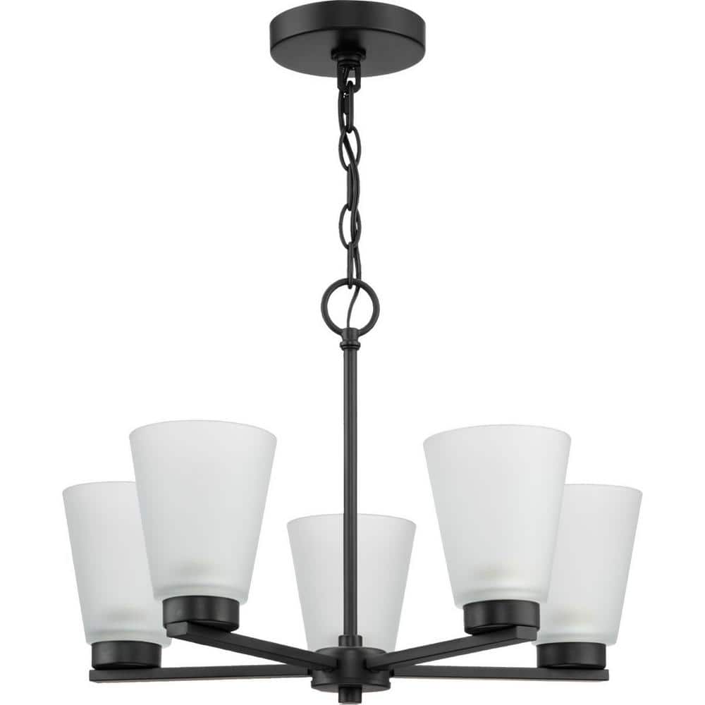 Elevate your living space with the Tanner Collection 5-Light Matte Black Transitional Chandelier by Progress Lighting. Featuring strong lines and a sophisticated matte black finish, this chandelier brings a modern aesthetic to any room. The soft etched glass shades diffuse light beautifully, creating an inviting atmosphere while easily fitting into a variety of decor styles.