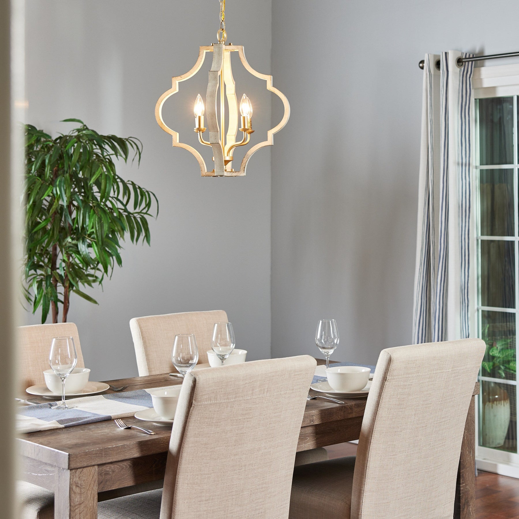 Illuminate your space with the Teigen 4-Light Geometric Pendant from Progress Lighting, featuring an antique white and vintage gold finish for a classic but fresh look. This pendant's open-cage design melds traditional elegance with a modern flair, suitable for any indoor setting.