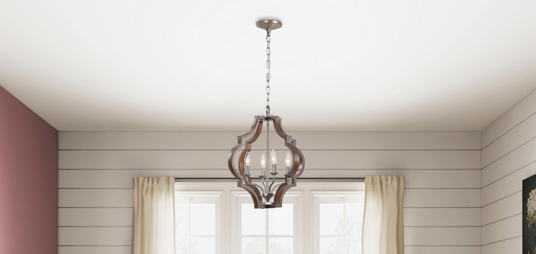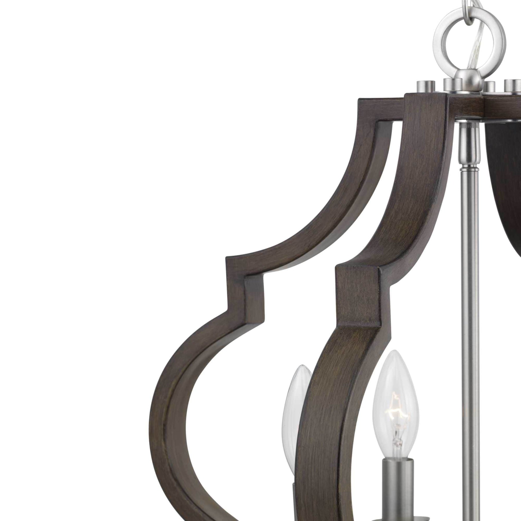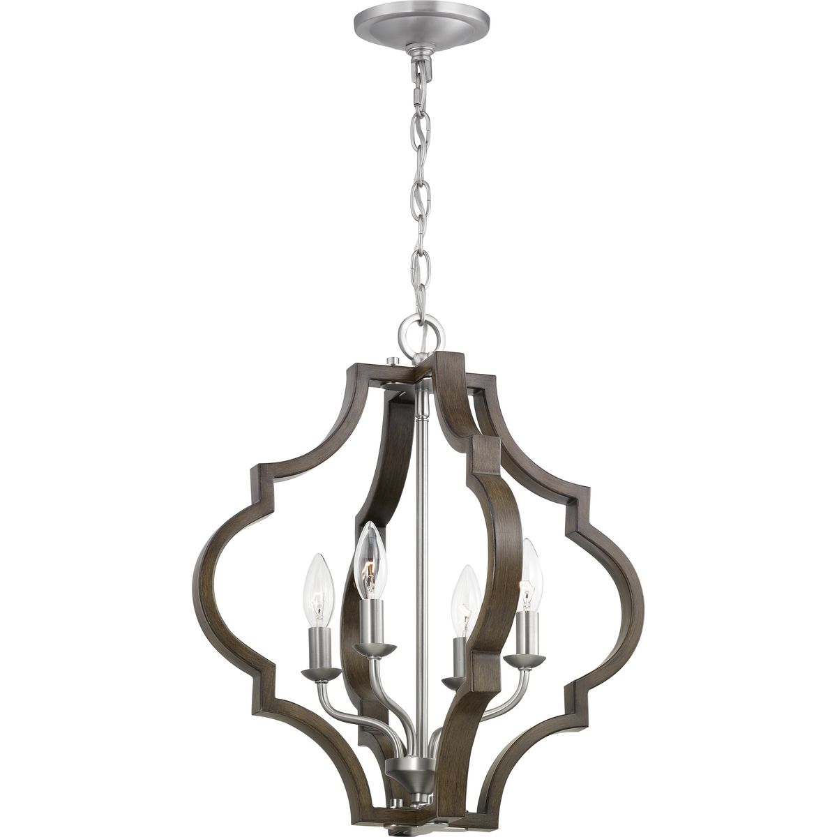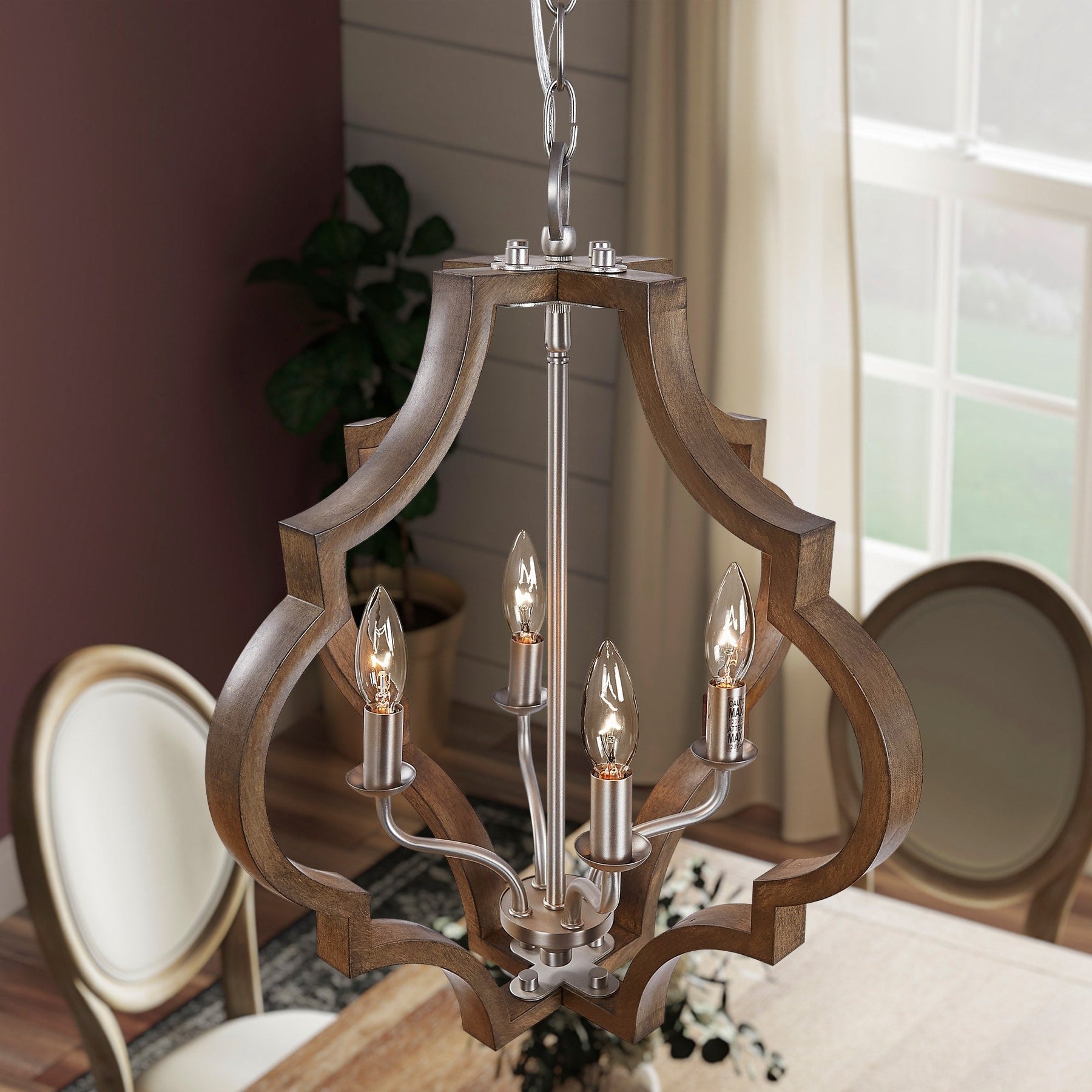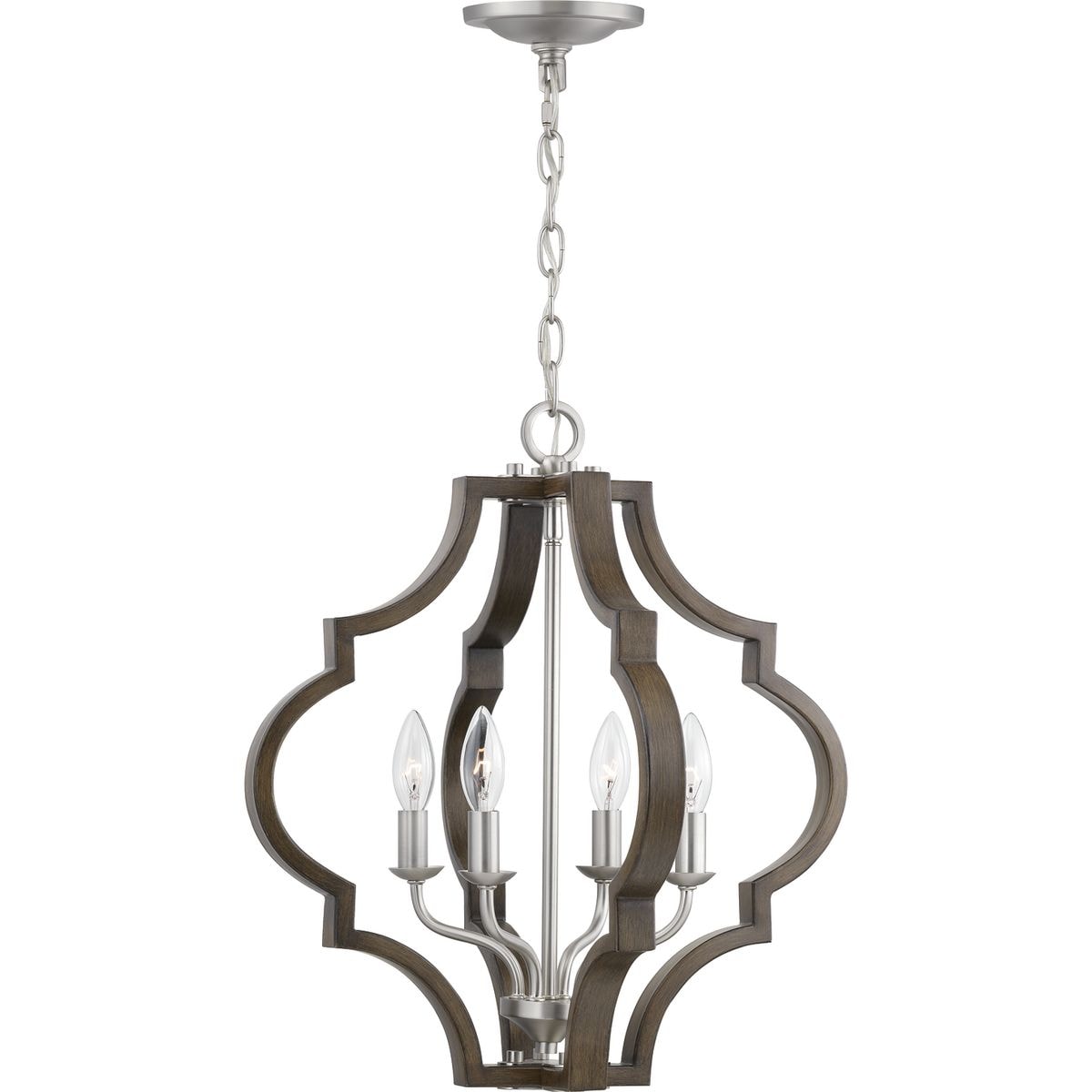 Elevate your space with the Progress Lighting Teigen 4-Light Pendant. Featuring a stunning blend of teak wood and satin nickel, this geometric farmhouse pendant light perfectly marries traditional elegance with modern flair. Ideal for kitchens, dining rooms, or bedrooms, its open cage design creates a captivating ambiance.