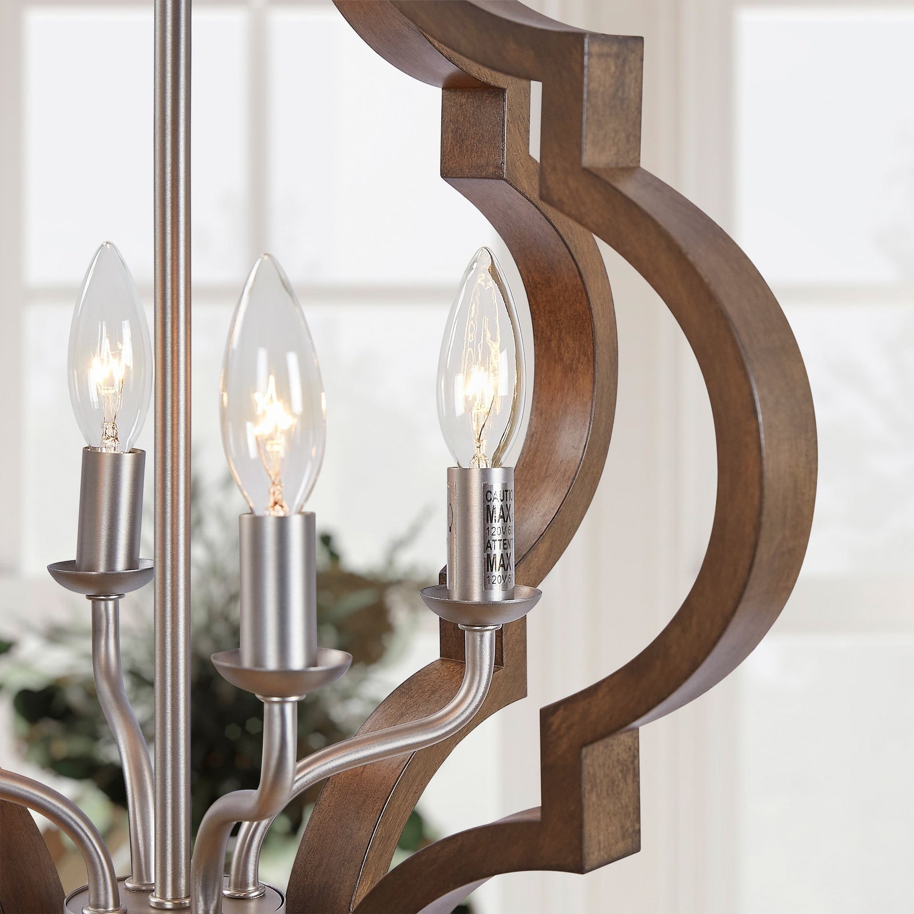 A: This pendant light uses four candelabra base bulbs (E-12), with a maximum wattage of 60 watts each, and is compatible with LED, CFL, or incandescent bulbs.