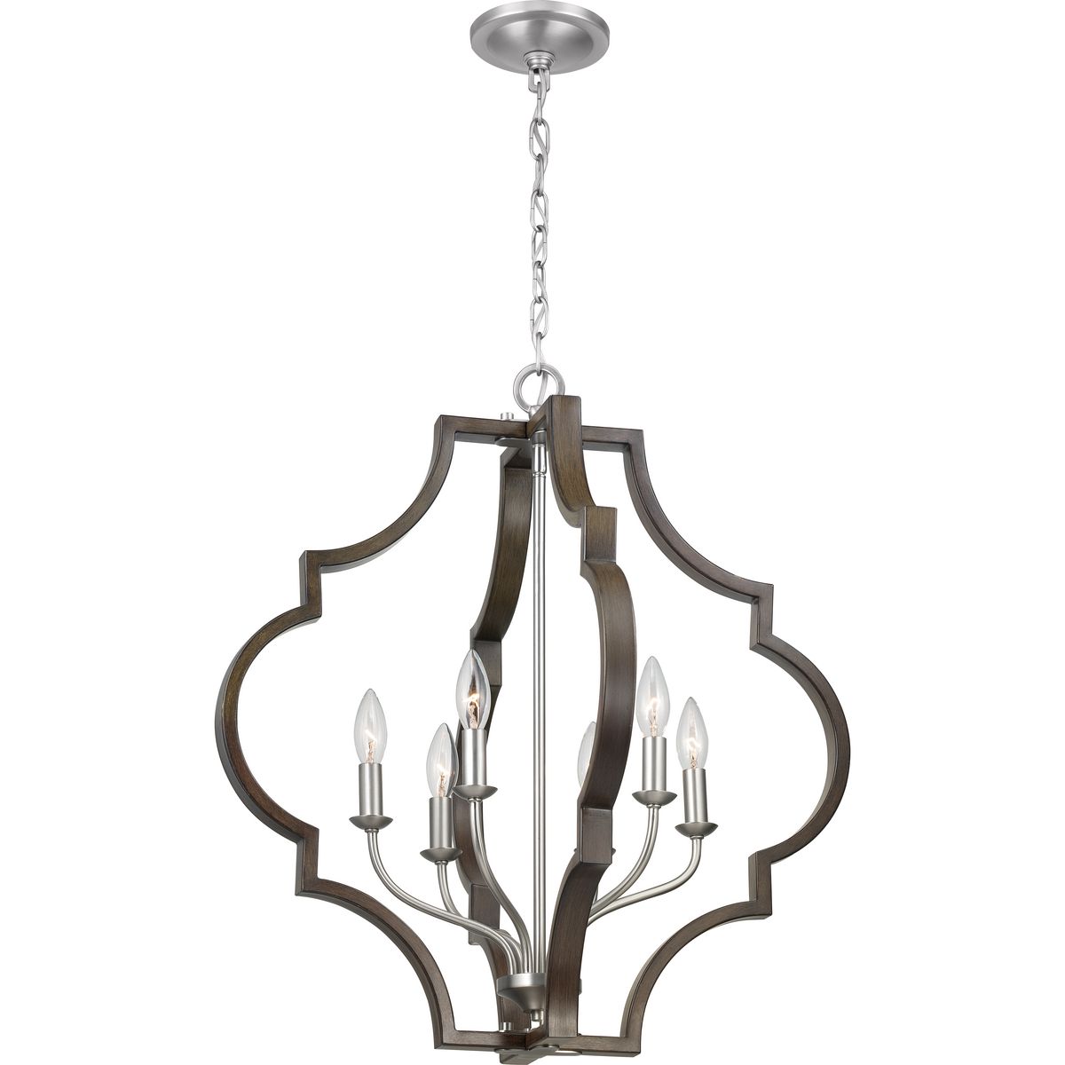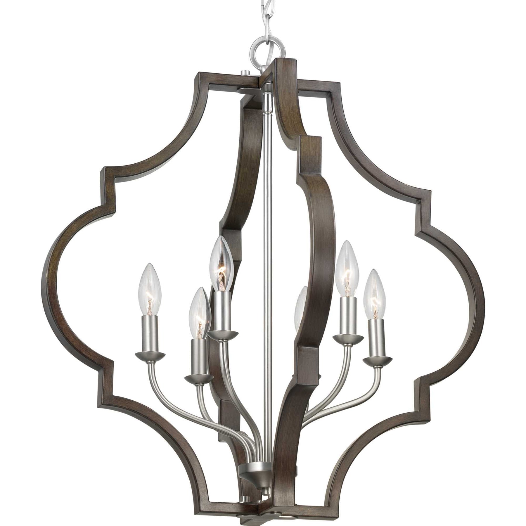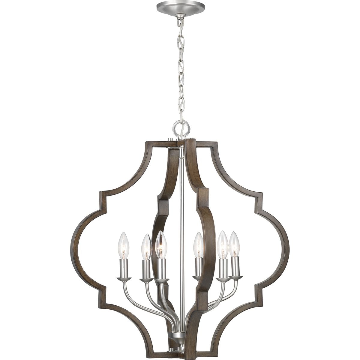 Progress Lighting Teigen 6-Light Teak Wood and Satin Nickel Farmhouse Geometric Large Hanging Pendant Light