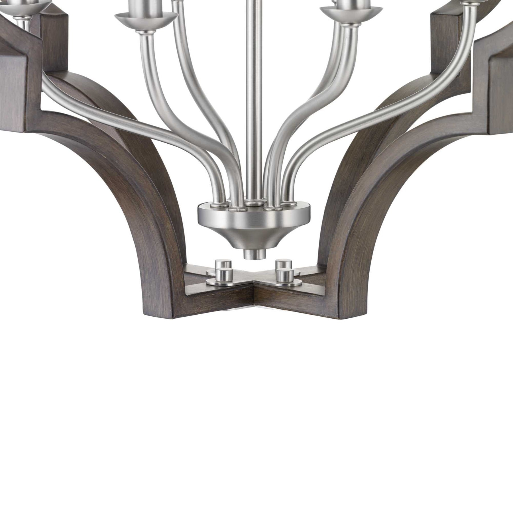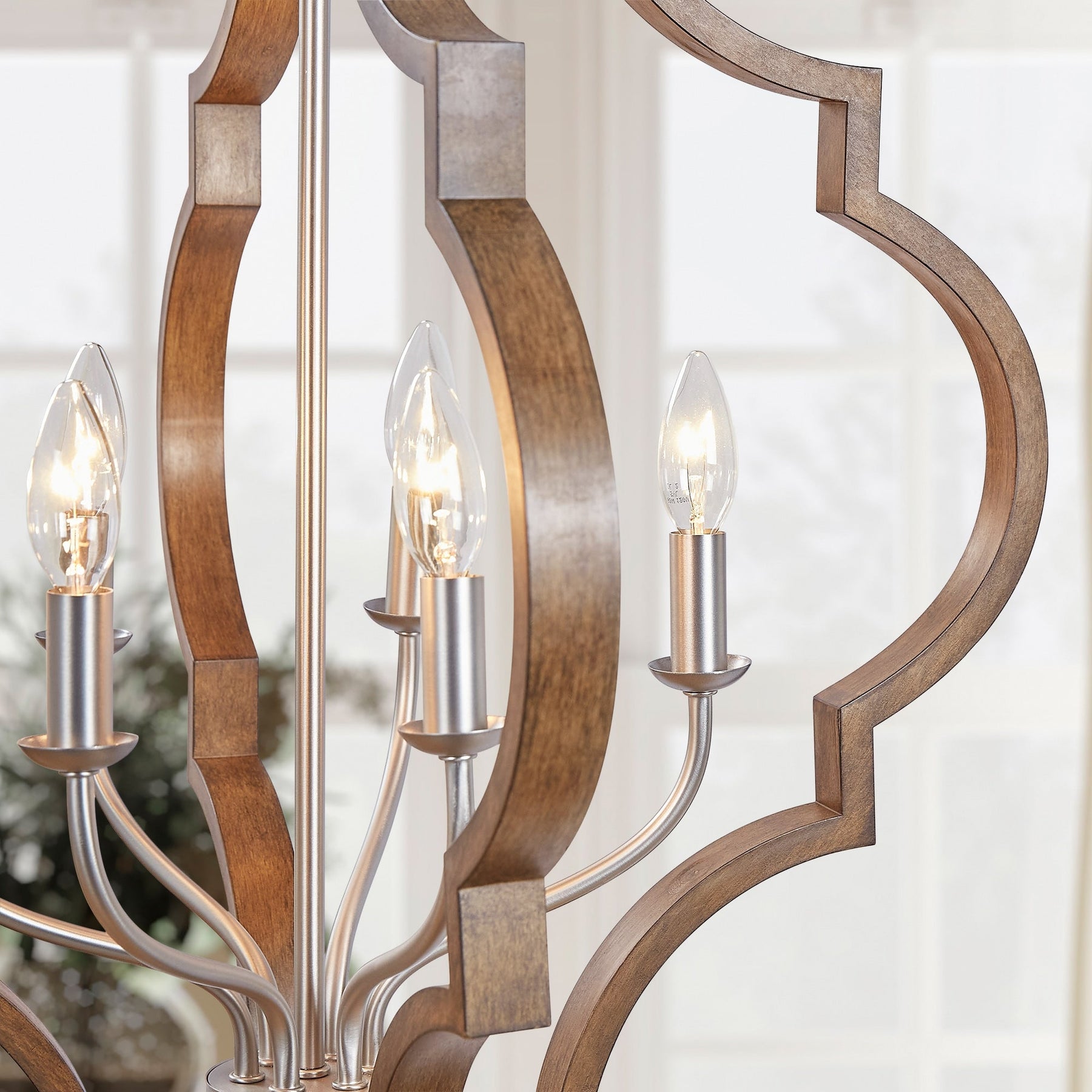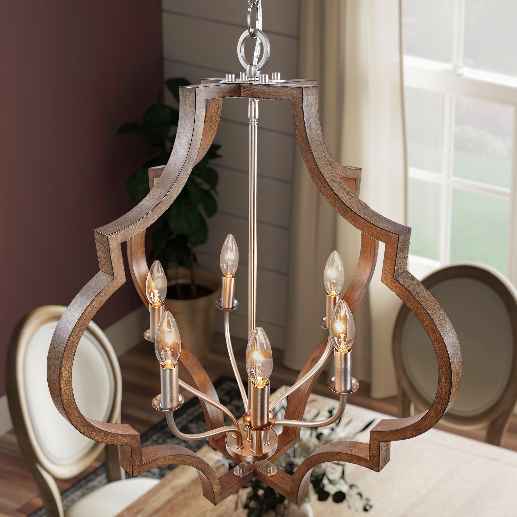 Progress Lighting Teigen 6-Light Teak Wood and Satin Nickel Farmhouse Geometric Large Hanging Pendant Light