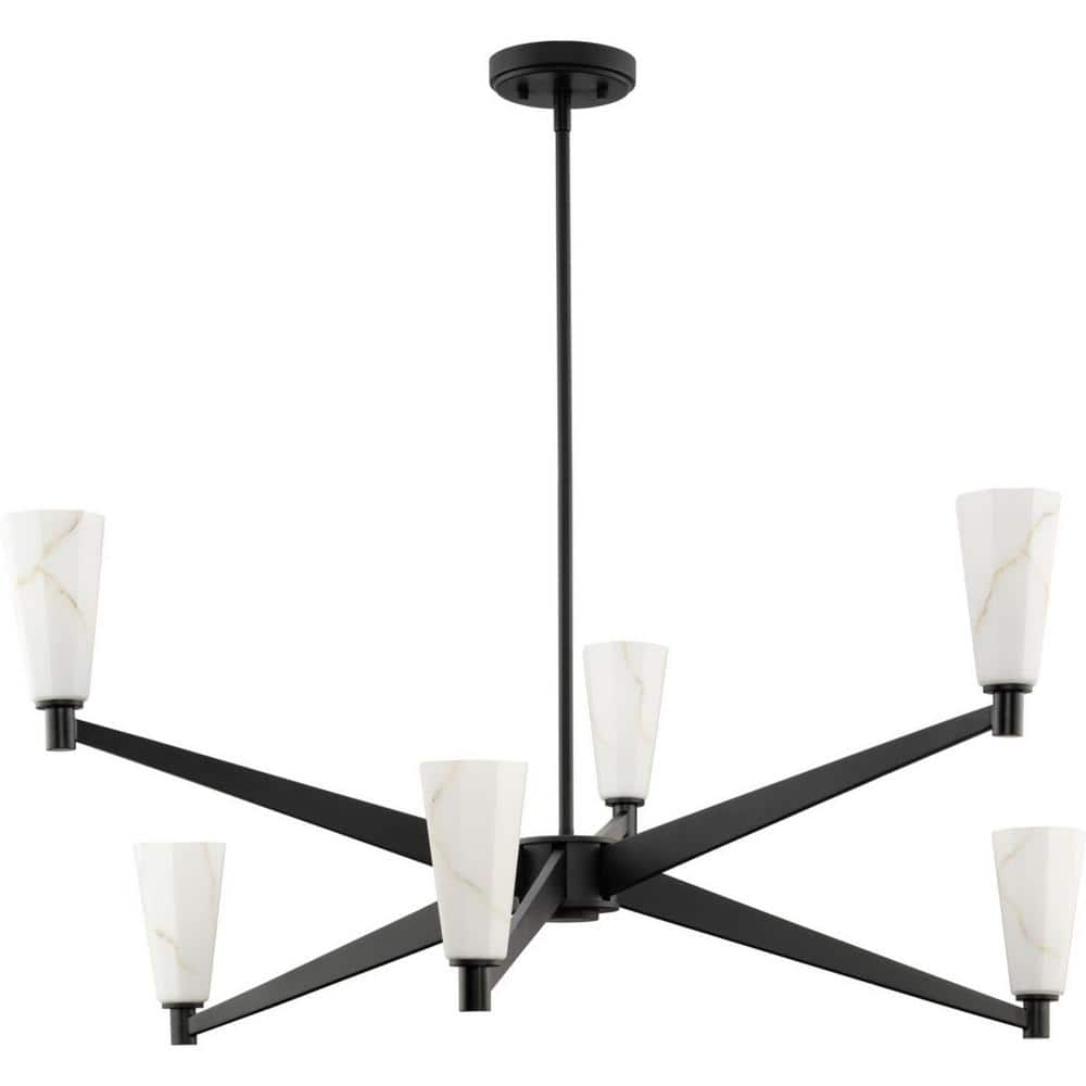 Illuminate your home with the Tosca Collection's 6-light chandelier from Progress Lighting. Featuring a modern luxe design, this fixture boasts a matte black finish with faux alabaster glass shades, offering both style and functionality. Perfect for dining areas or foyers, it casts a stunning ambient glow that captivates and enhances any space.
