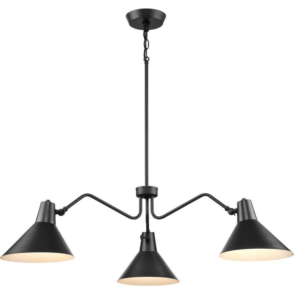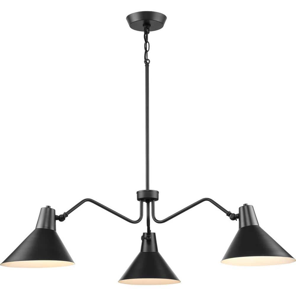 The Trimble Collection 3-Light Matte Black Chandelier by Progress Lighting blends mid-century modern flair with industrial elegance. Featuring striking angular metal shades and a matte black finish, this chandelier delivers focused illumination perfect for living rooms, dining areas, or bedrooms. Ideal for contemporary and industrial decors, it offers both style and lighting versatility.