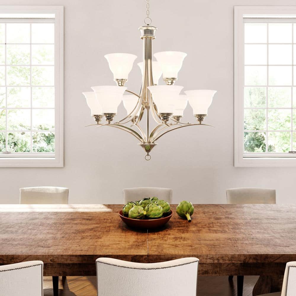 Elevate your home ambiance with the Trinity Collection 9-Light Brushed Nickel Chandelier. This statement piece combines etched glass with a sleek brushed nickel finish, offering timeless elegance suitable for dining areas, kitchens, or grand entryways.