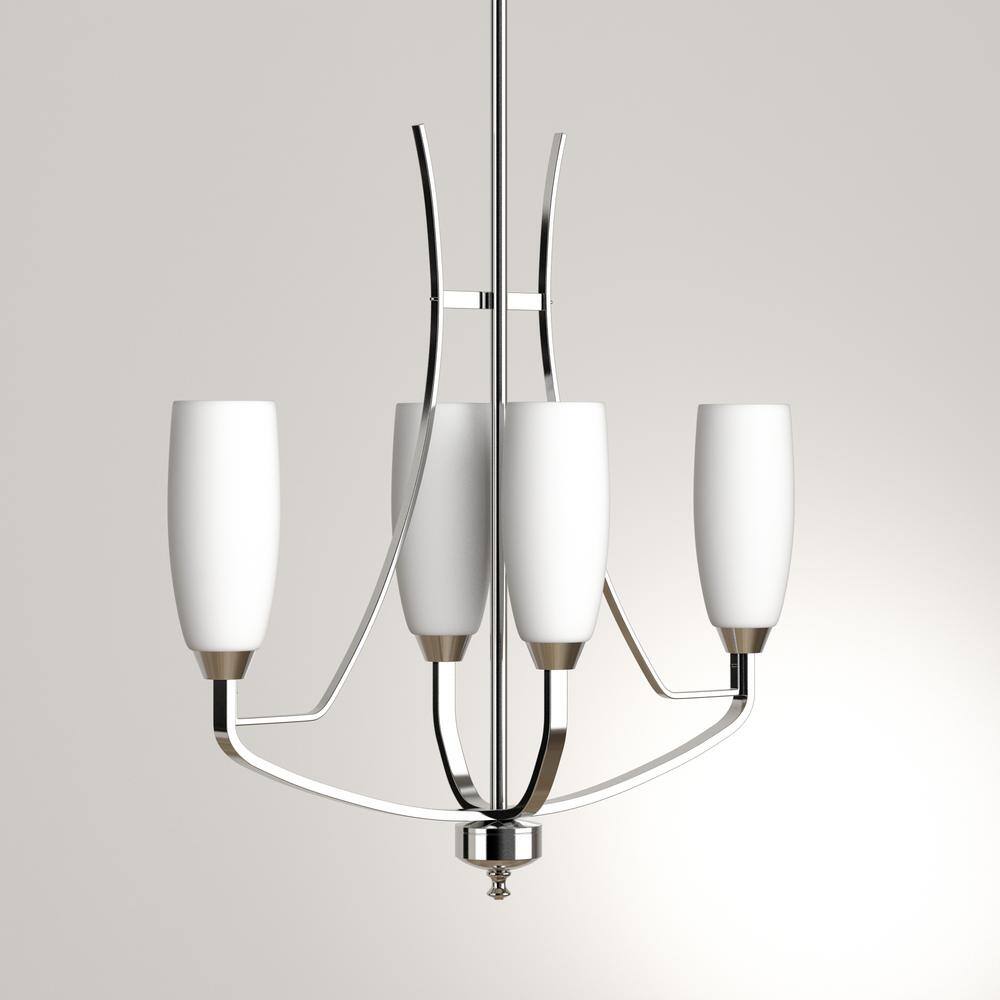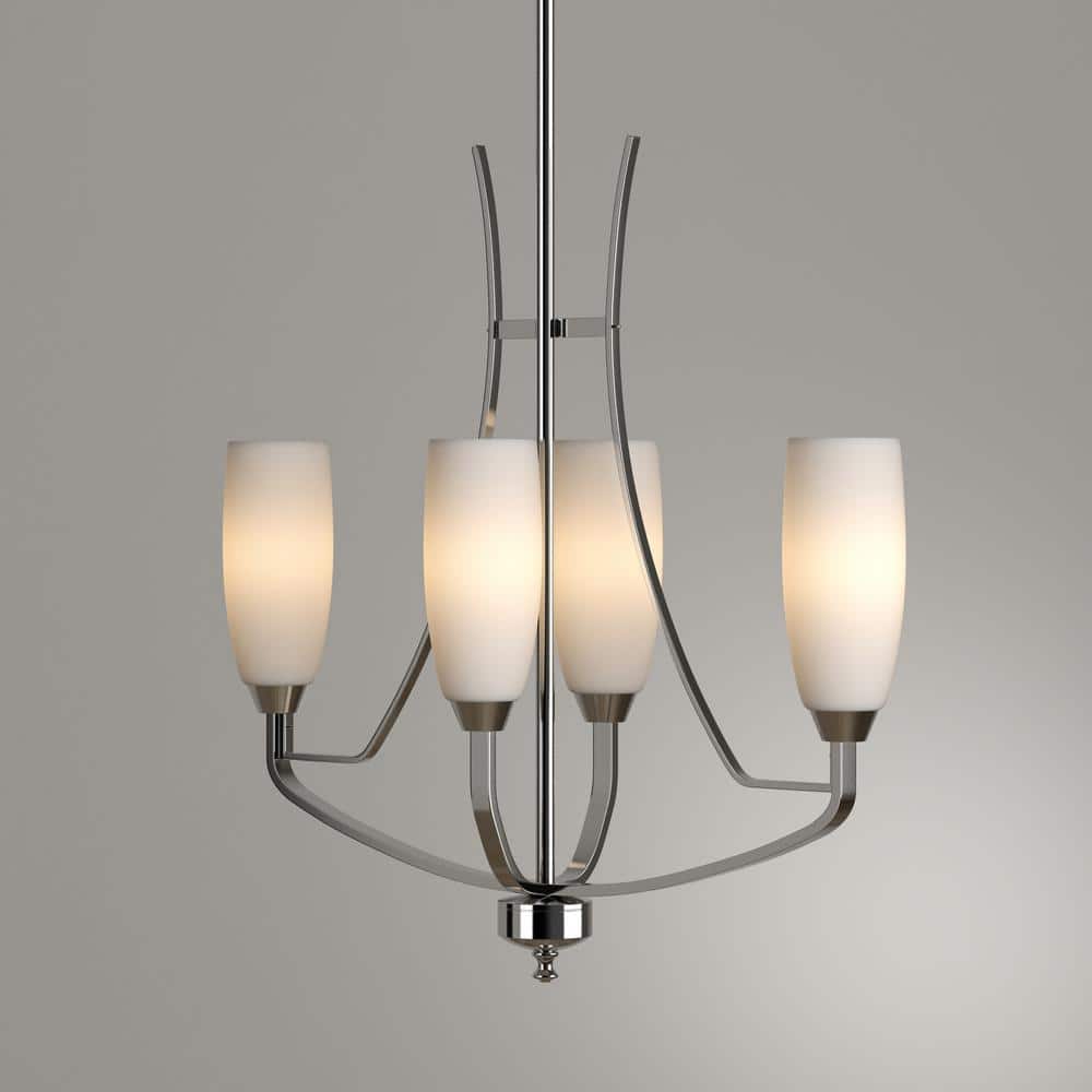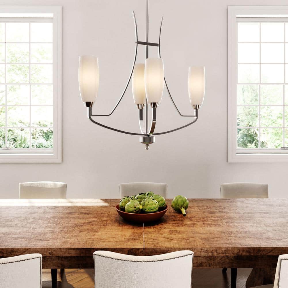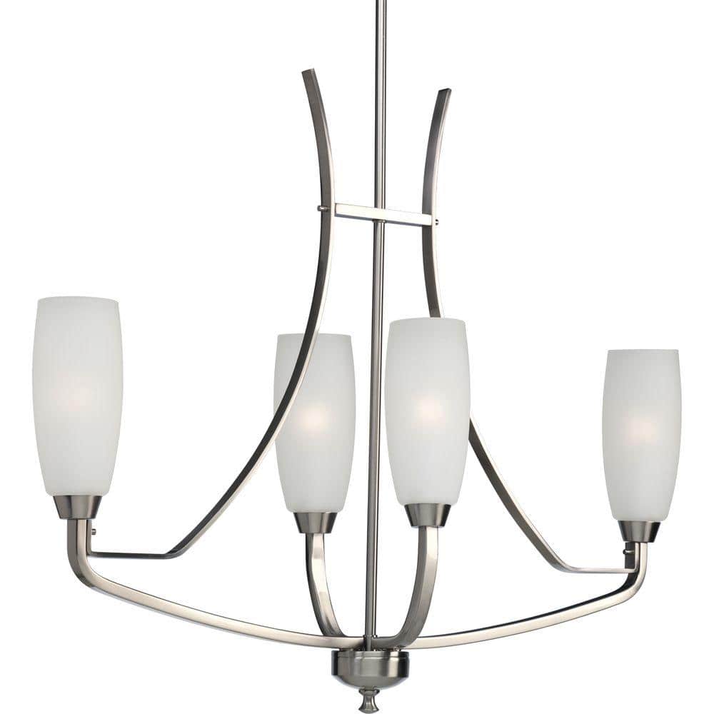 The Wisten Collection 4-Light Brushed Nickel Chandelier by Progress Lighting exudes modern elegance with its sweeping arcs and etched glass shades. Featuring a brushed nickel finish, this fixture adds a contemporary flair to any room, serving as a focal point in dining areas, kitchens, or living spaces. Its versatile design complements any modern or transitional decor.