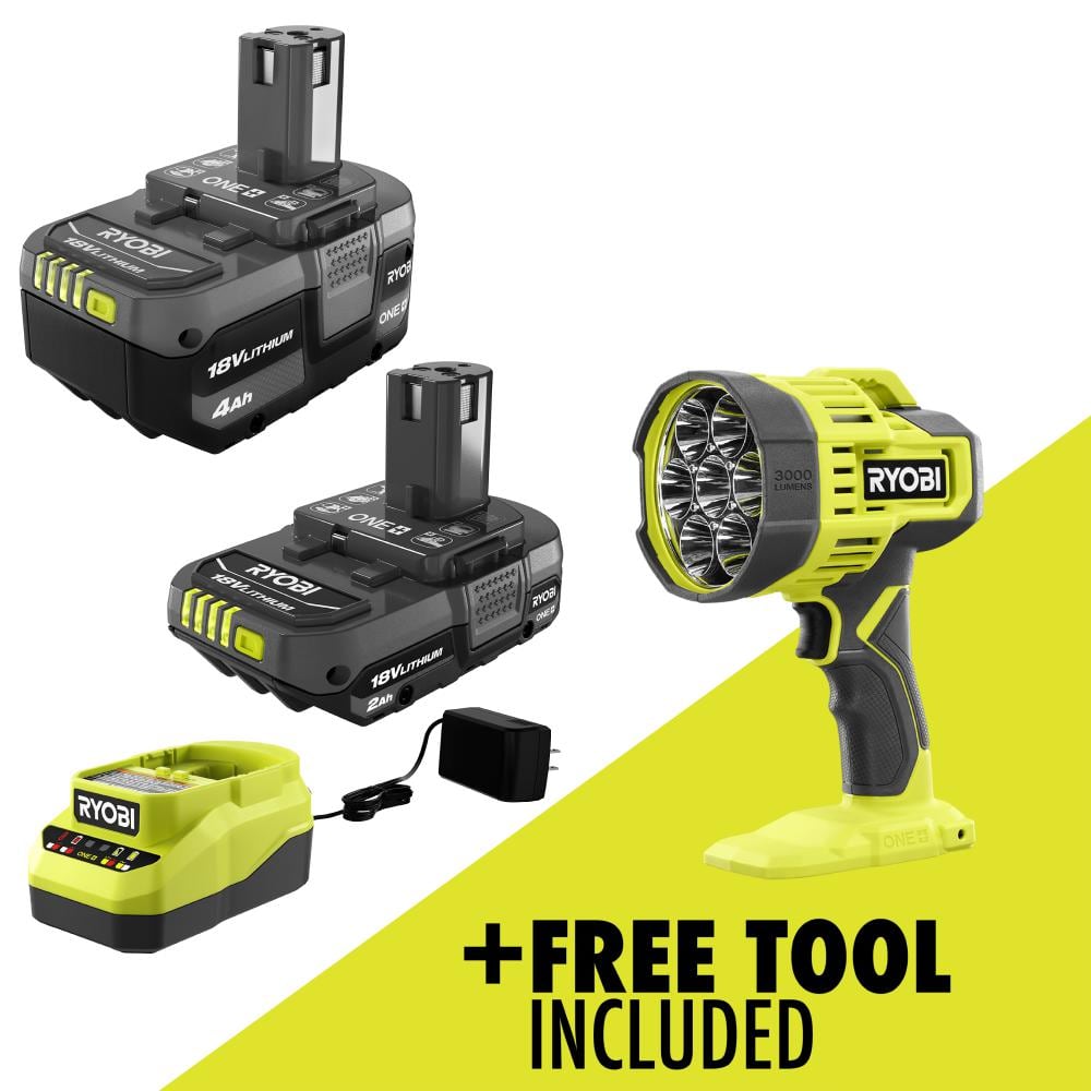 RYOBI ONE+ 18V Lithium-Ion Kit with 2.0 Ah and 4.0 Ah Batteries, Charger, and Free ONE+ 18V Cordless LED Spotlight
