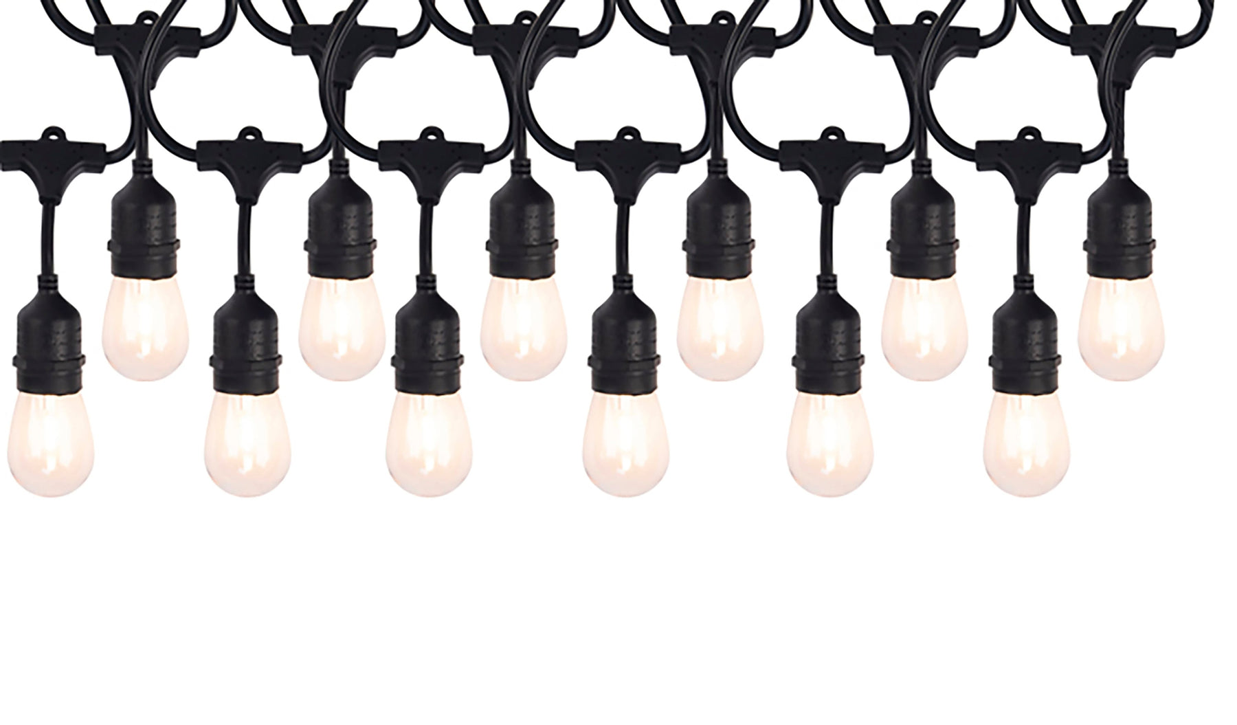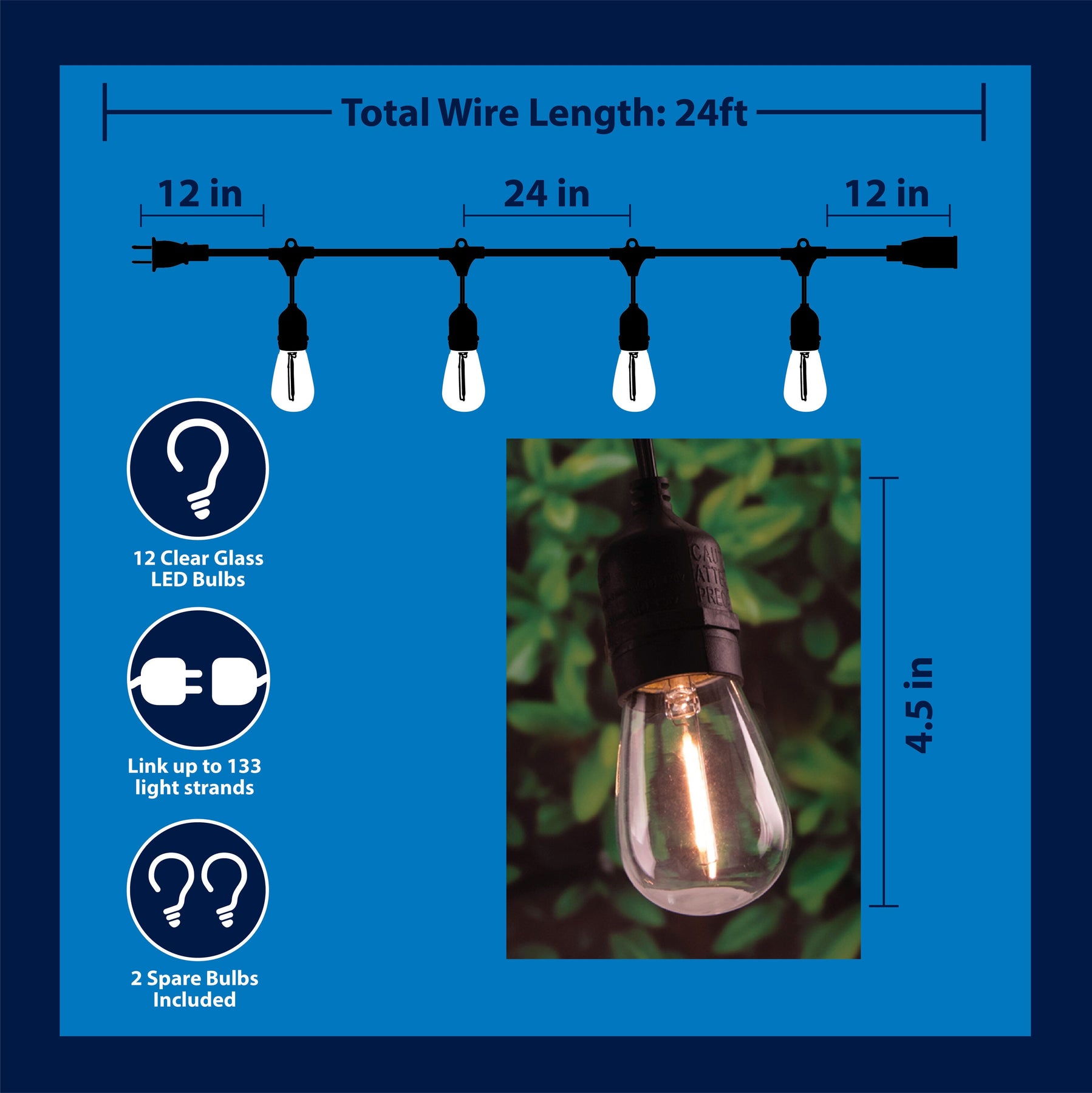 Commercial-grade 24-ft plug-in string lights with 12 vintage-style LED Edison bulbs and black cord. Wet-rated for year-round outdoor use, perfect for patios, porches, and entertaining spaces.