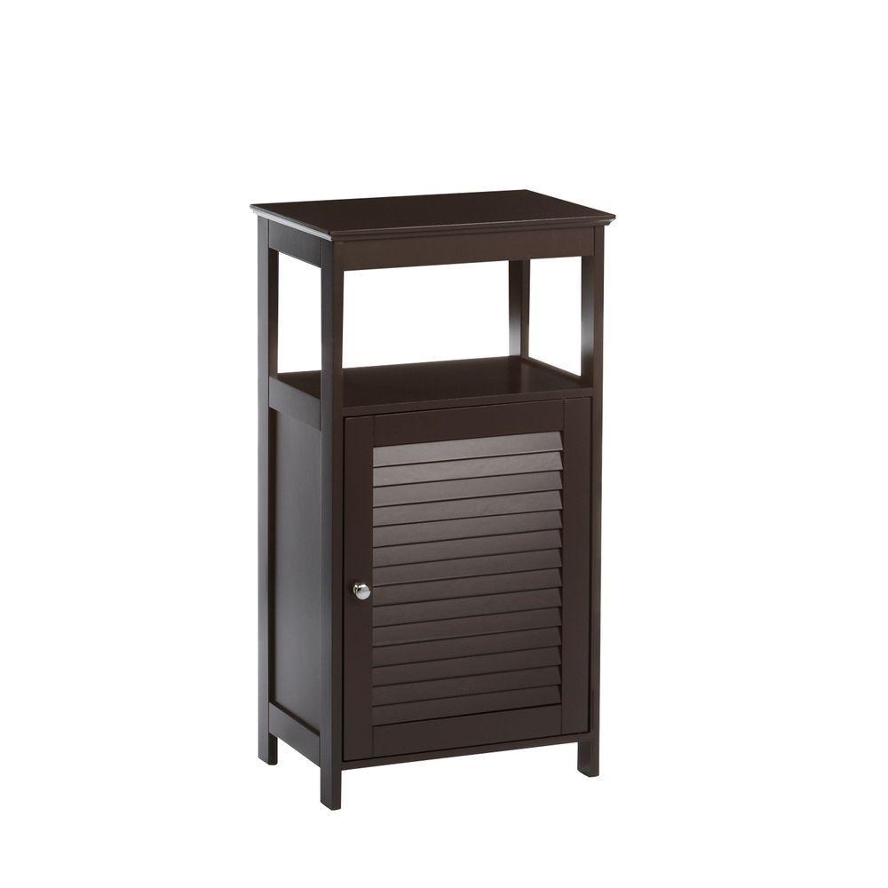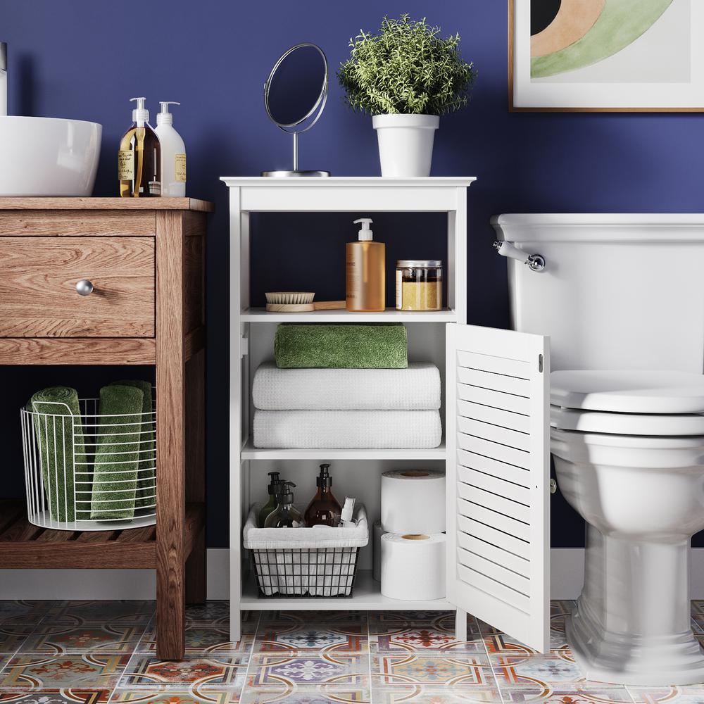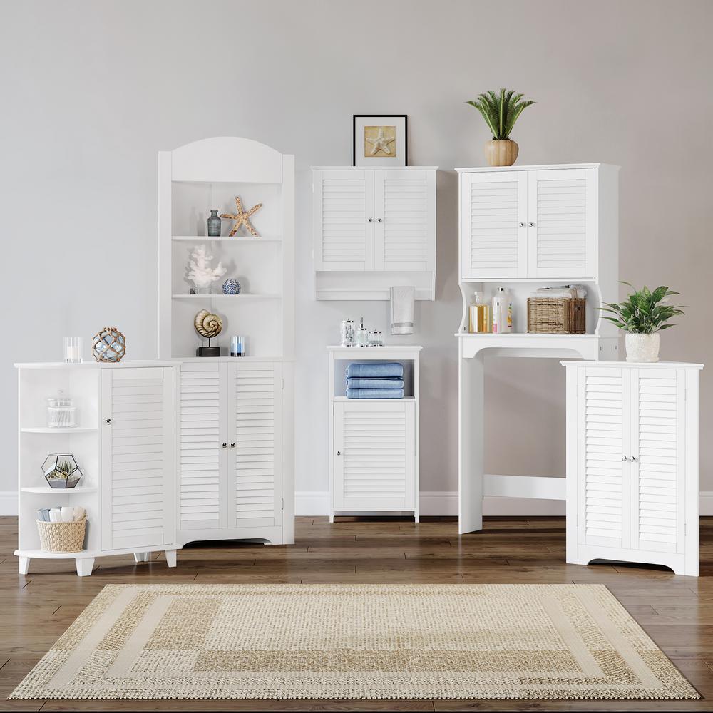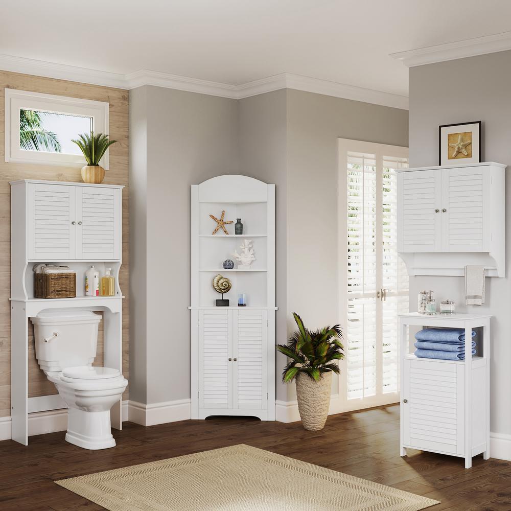 RiverRidge Home Single Door Floor Cabinet in a white finish from the Ellsworth Collection features a convenient single shutter door design with an open shelf for display or storage and another shelf inside the cabinet. Convenient and stylish extra bathroom storage. Also can be used as added storage space in other rooms. Modern, clean design adds instant appeal to any decor. Sturdy, engineered wood construction offers beautiful finish. Pair with other pieces from the River Ridge Home Ellsworth Collection to complete your ensemble. Simple to assemble and mount.