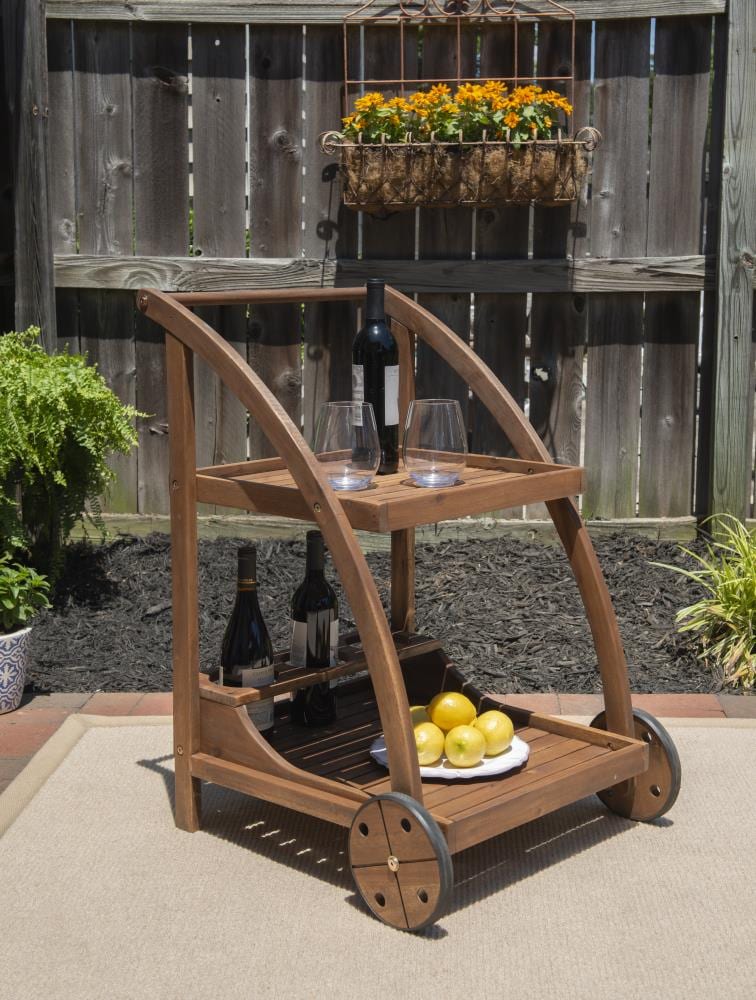 A: To maintain its appearance, clean the cart with a damp cloth and avoid harsh chemicals. For outdoor use, consider applying a teak finish protector seasonally.